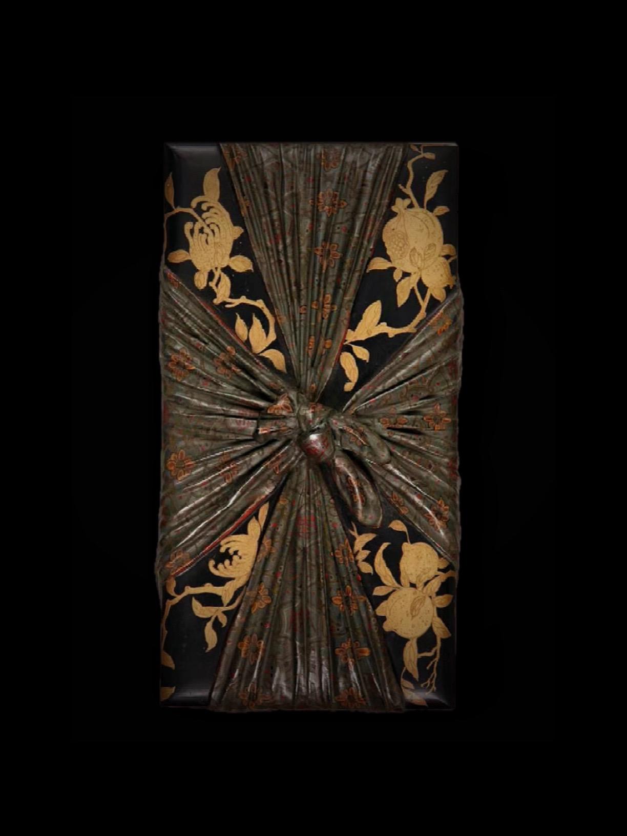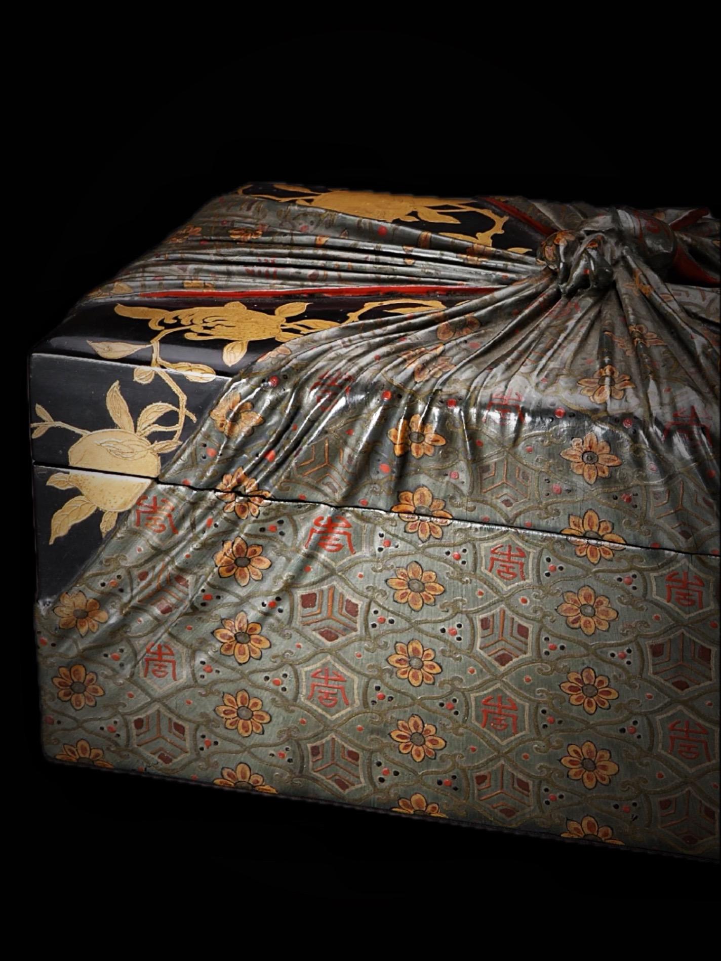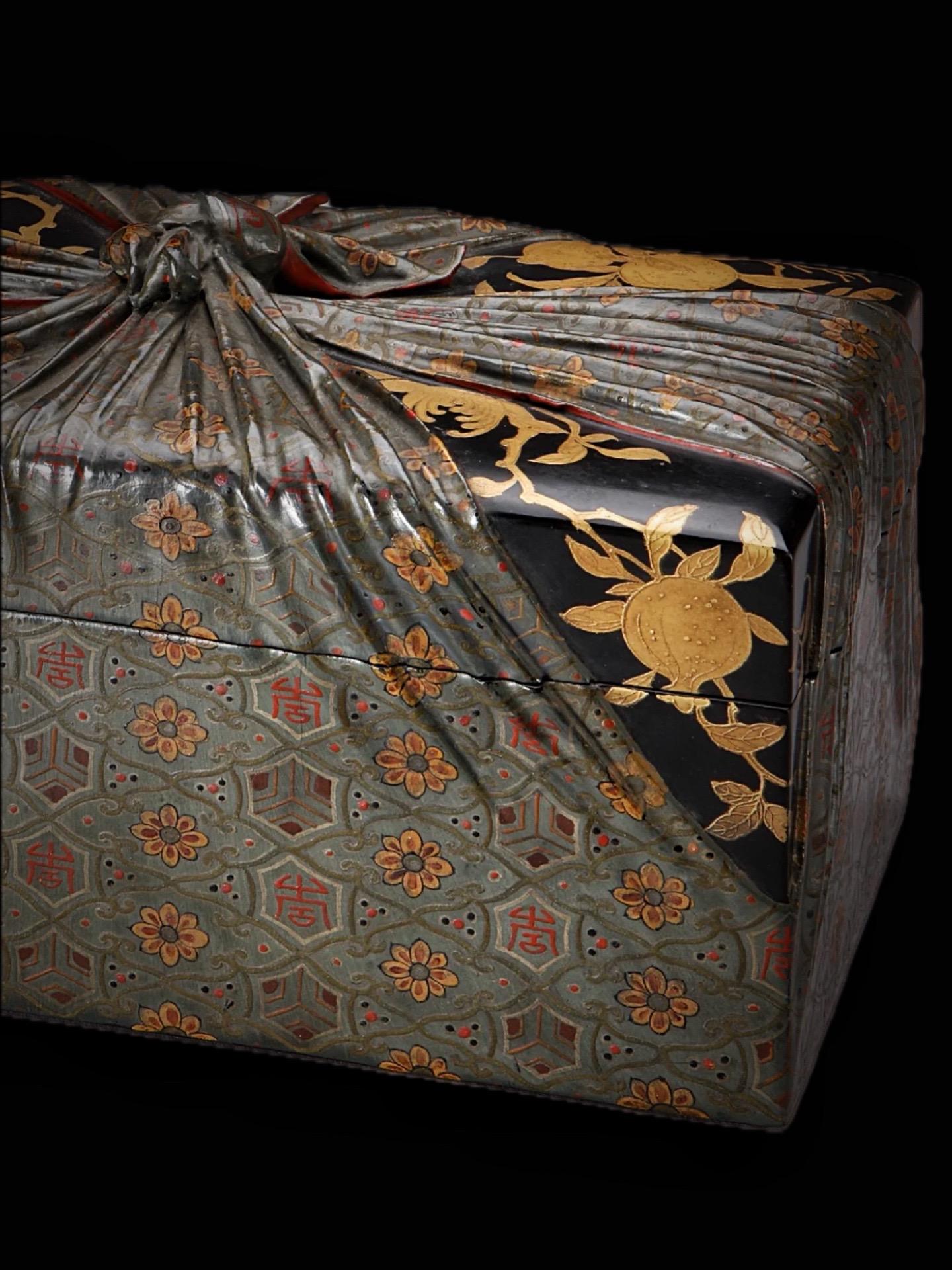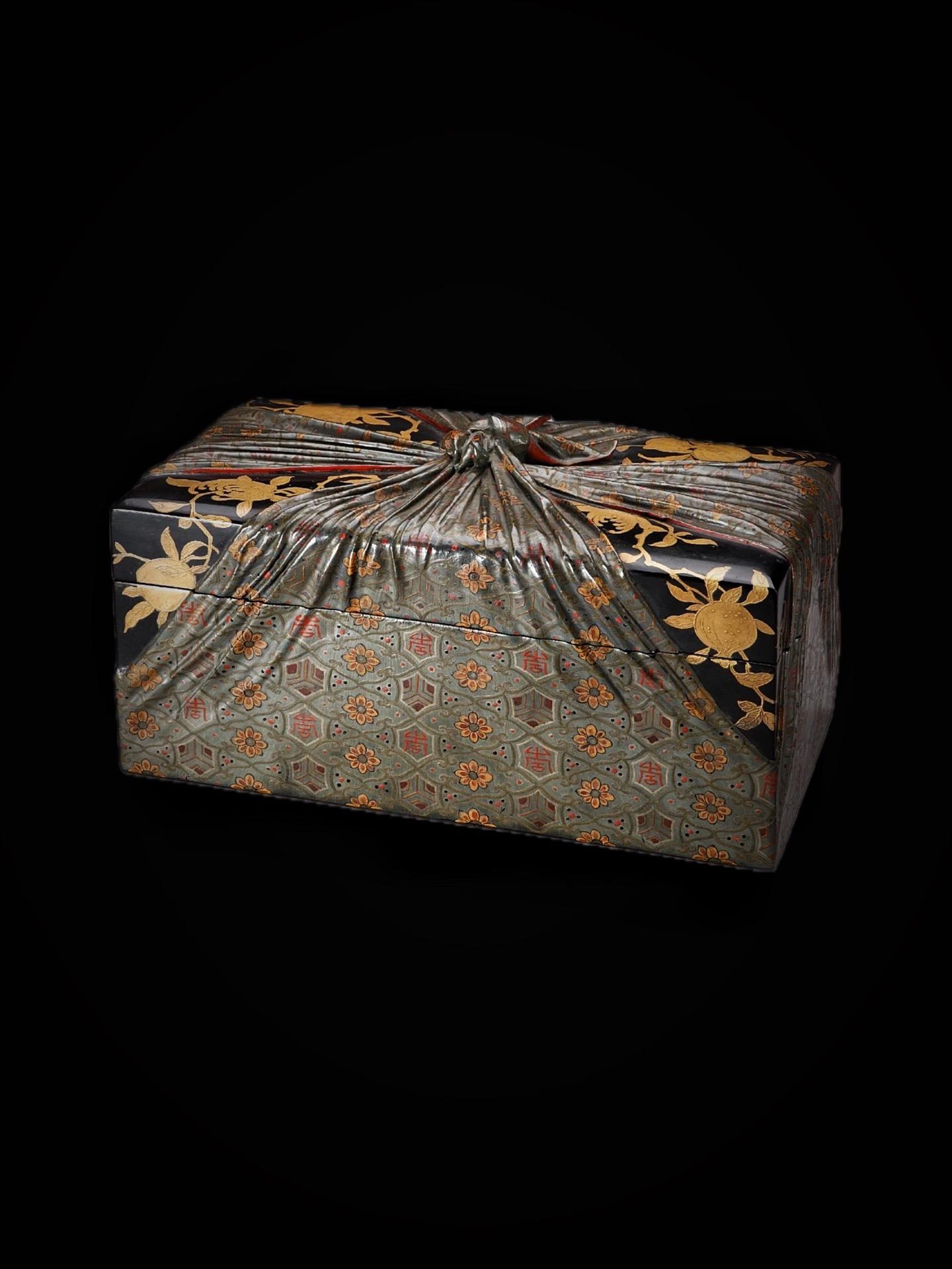 清代·描金彩漆包袱式纹长方形盒。朕看得尔造办处所进活计俱是朕交下着做的活计,现今造办处匠役有几百名,何必旷闲?尔等寻些活计与他们做——清· 雍正五年养心殿造办处档案