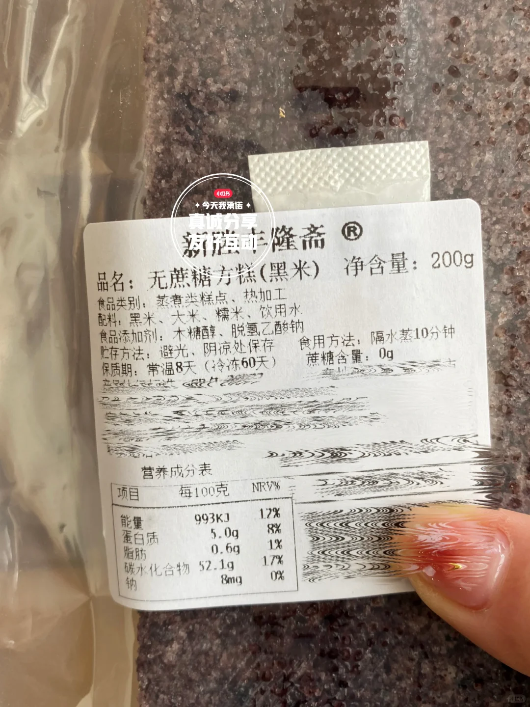 一定要加热吃,贼粘贼糯! 口感微甜~喜欢吃糯叽叽的可以试试 一块黑米糕100g,一餐的主食刚刚好饱腹感杠杠的!