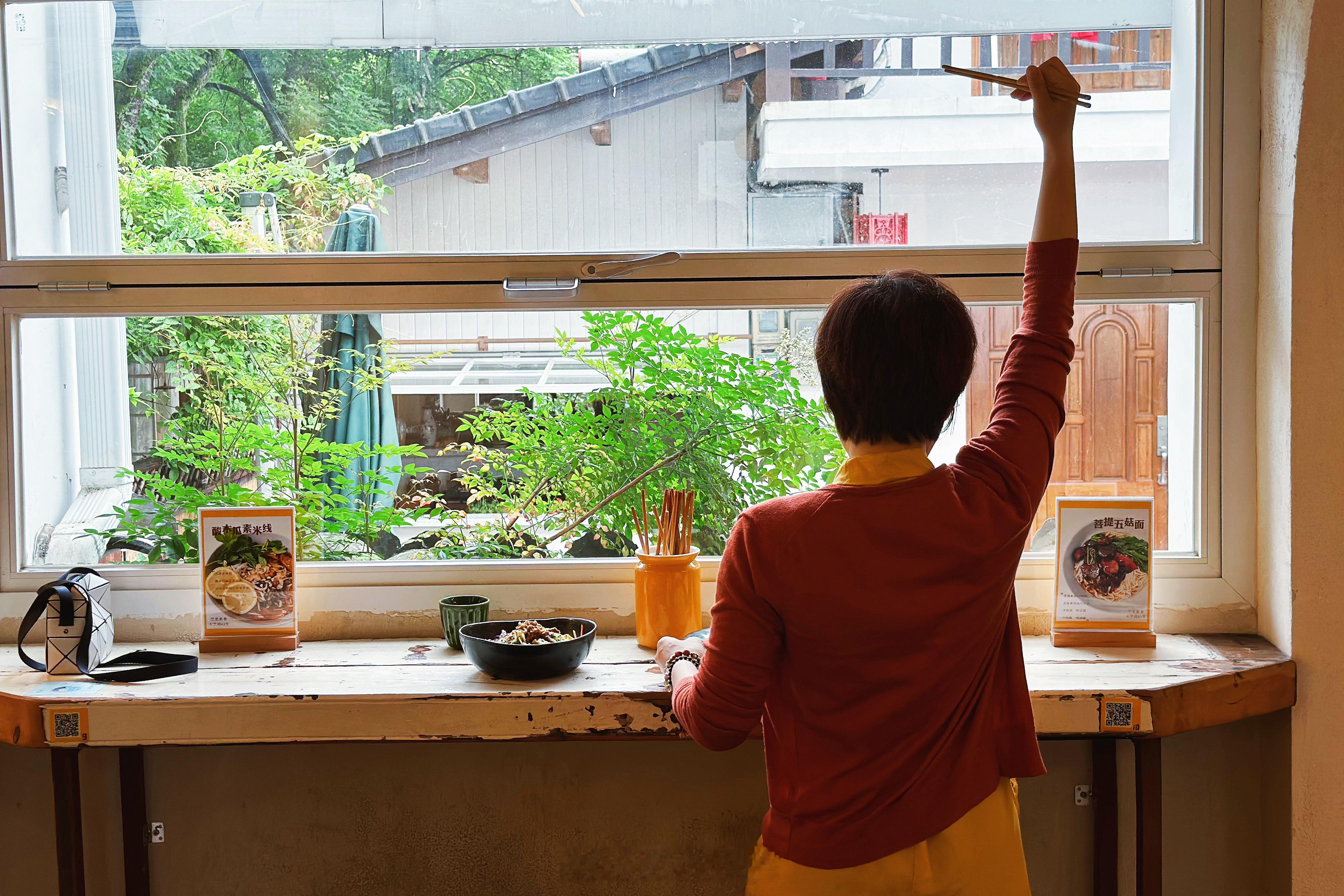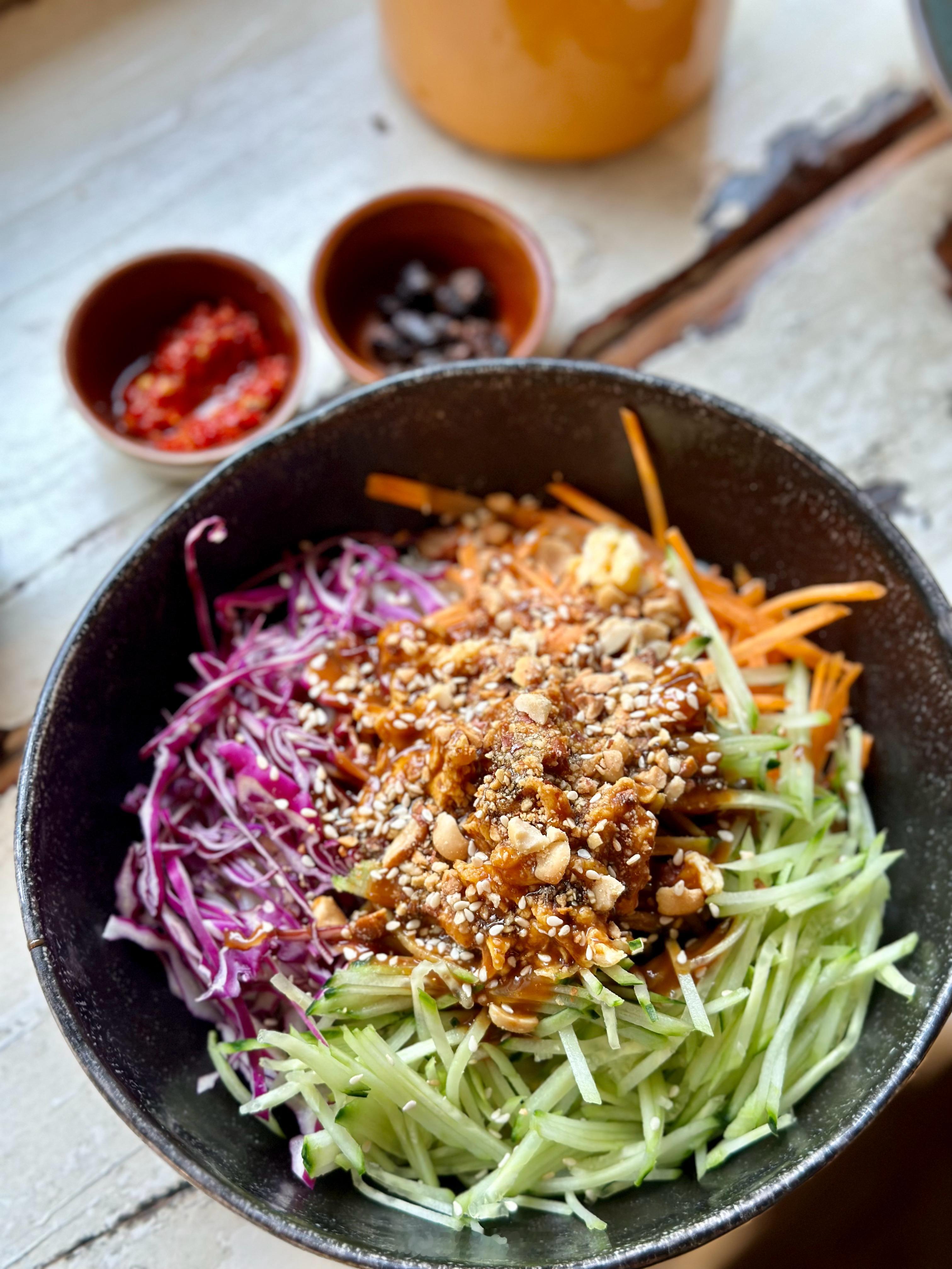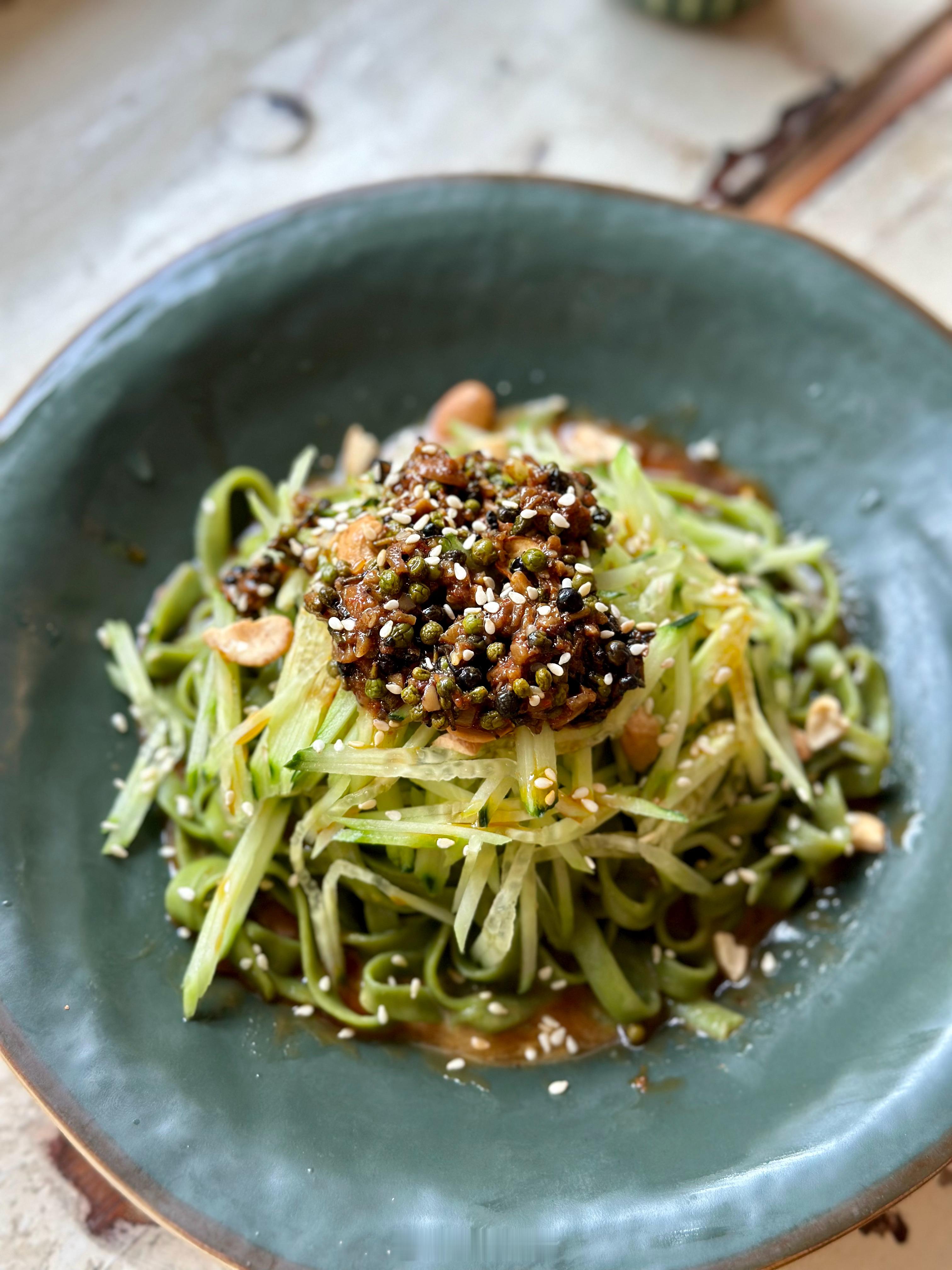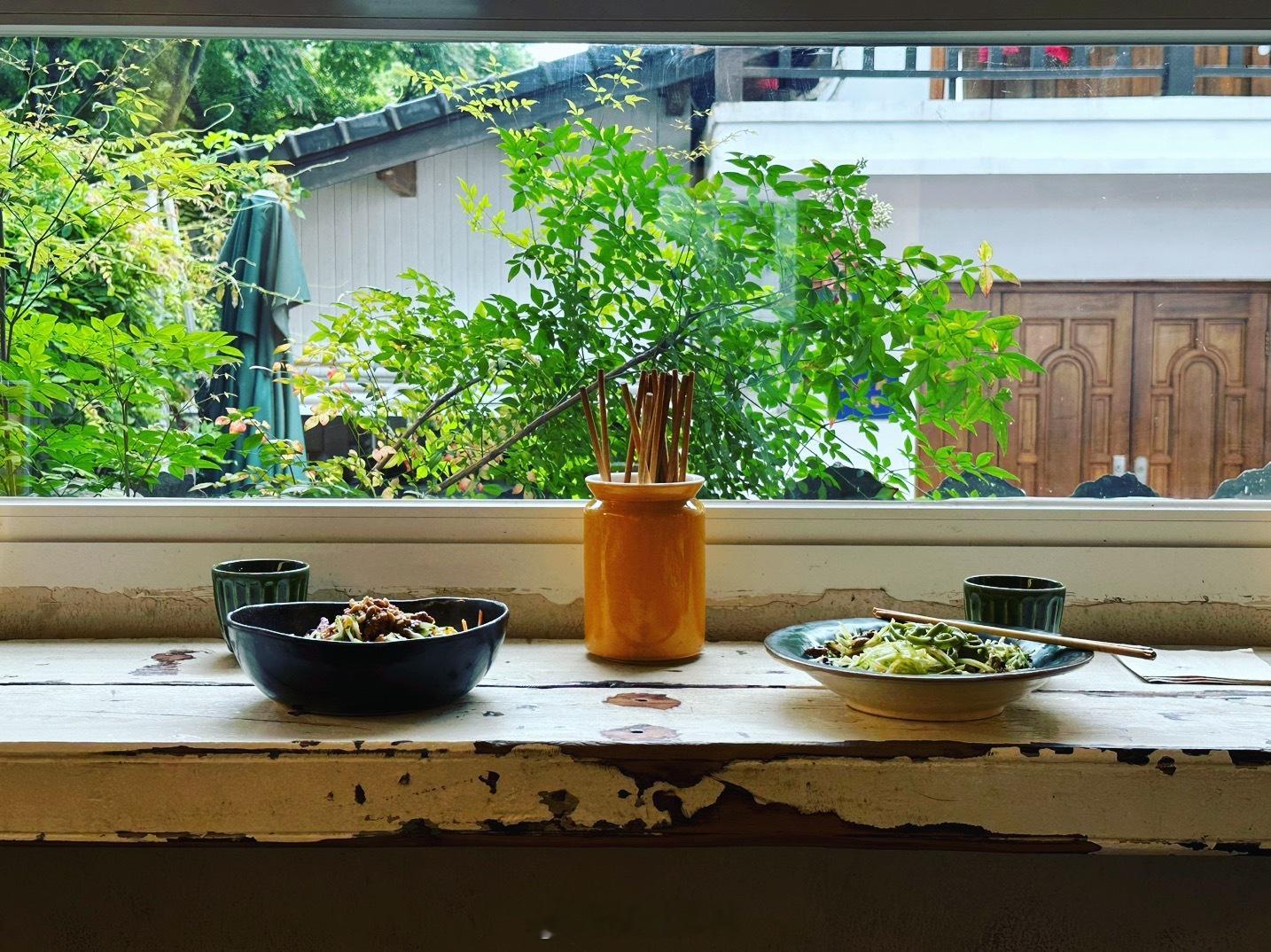 我和菠菜总在杭州过周末,说好一路吃素。早餐一人一碗素面。【竺里Nothing fancy】是一家很佛系的面馆,早餐时间店里客人不多,老板播放着《金刚经》。我和菠菜点了招牌拌面,竺里拌拌和木姜子夏季限定款。店里自己熬的木姜子酱,配菠菜面,味道很独特,就是油有点大。