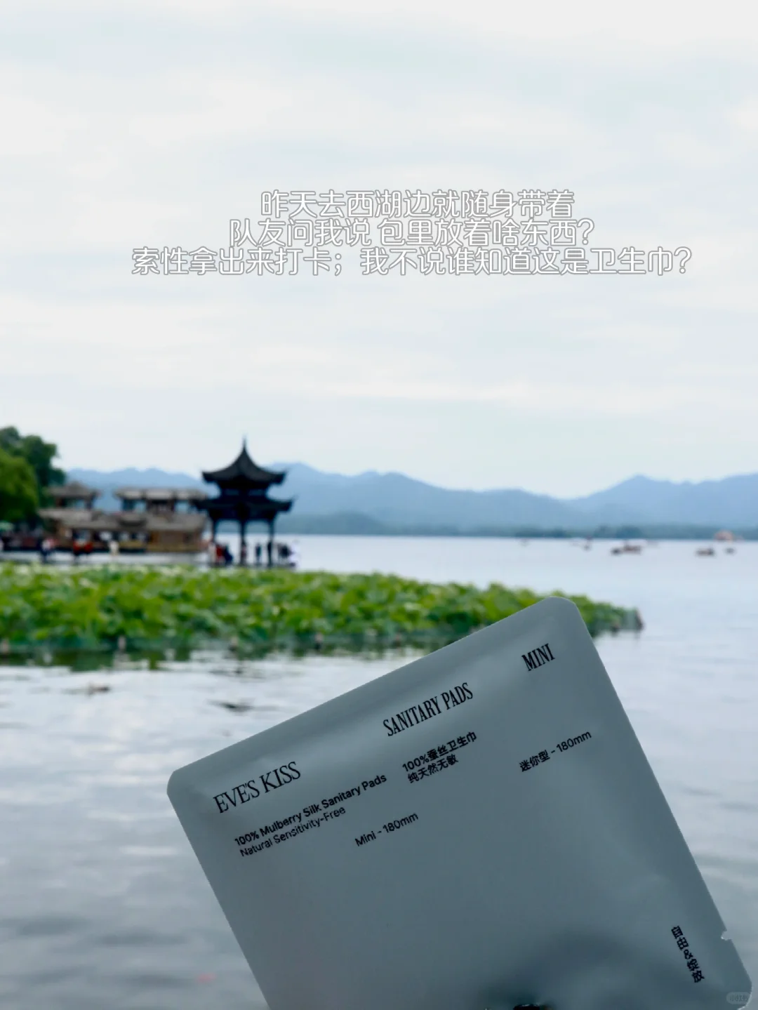 昨天去西湖边就随身带着 队友问我说 包里放着啥东西?索性拿出来打卡;我不说谁知道这是卫生巾[偷笑R] 我在杭州!我为夏娃之吻打call[害羞R]
