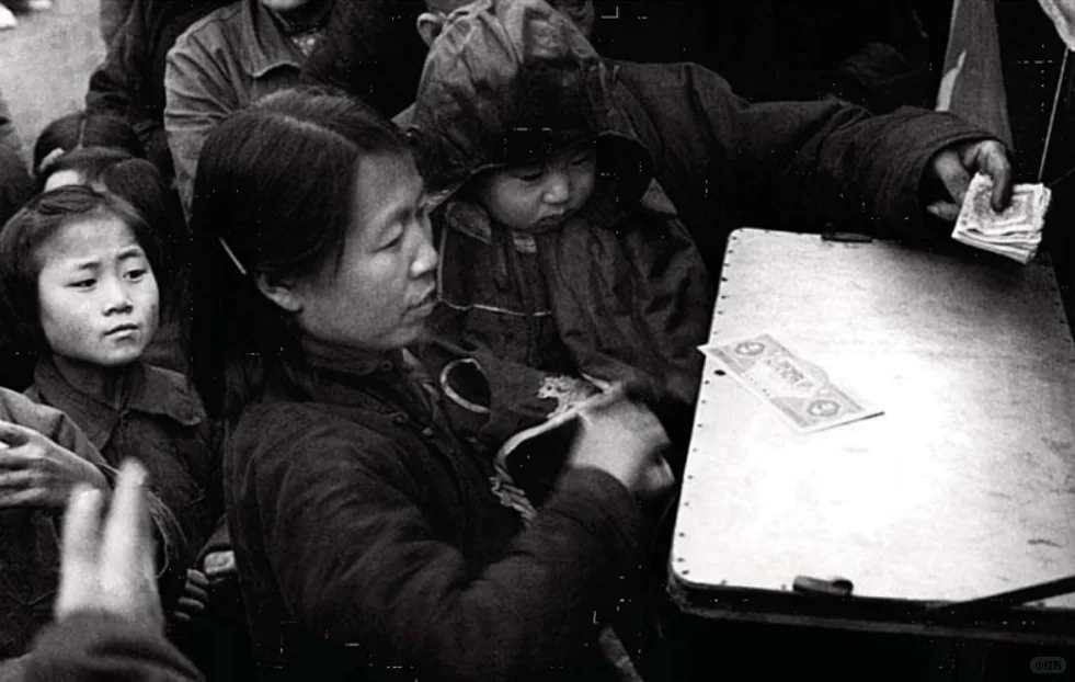 图3:50年代拿着粮票争先恐后排队买粮食的人群