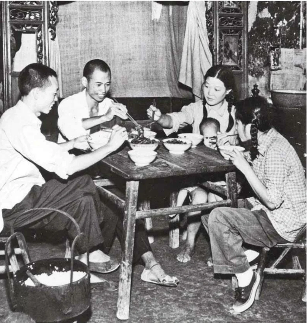 图6:1957年,湖南衡山县霞流市乡在1956年遭受灾荒,由于实行粮食统购统销,粮价平稳,保证供应,灾区情况比较安定。图为农业社贫农成吉秋一家在吃饭