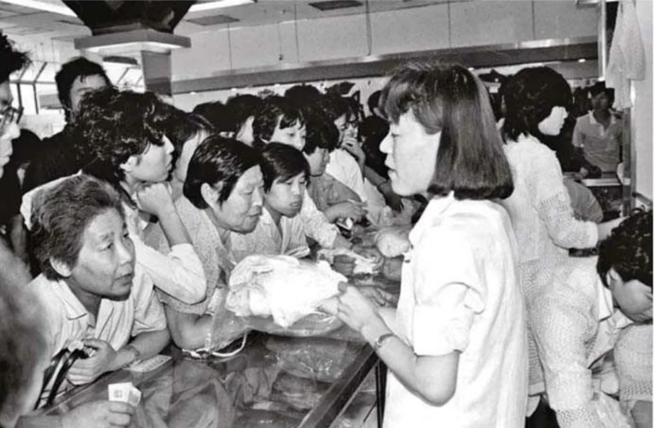 图8:1988年,担心涨价的顾客捏着钱和票拥挤在北京隆福大厦柜台前购买毛线和毛织物