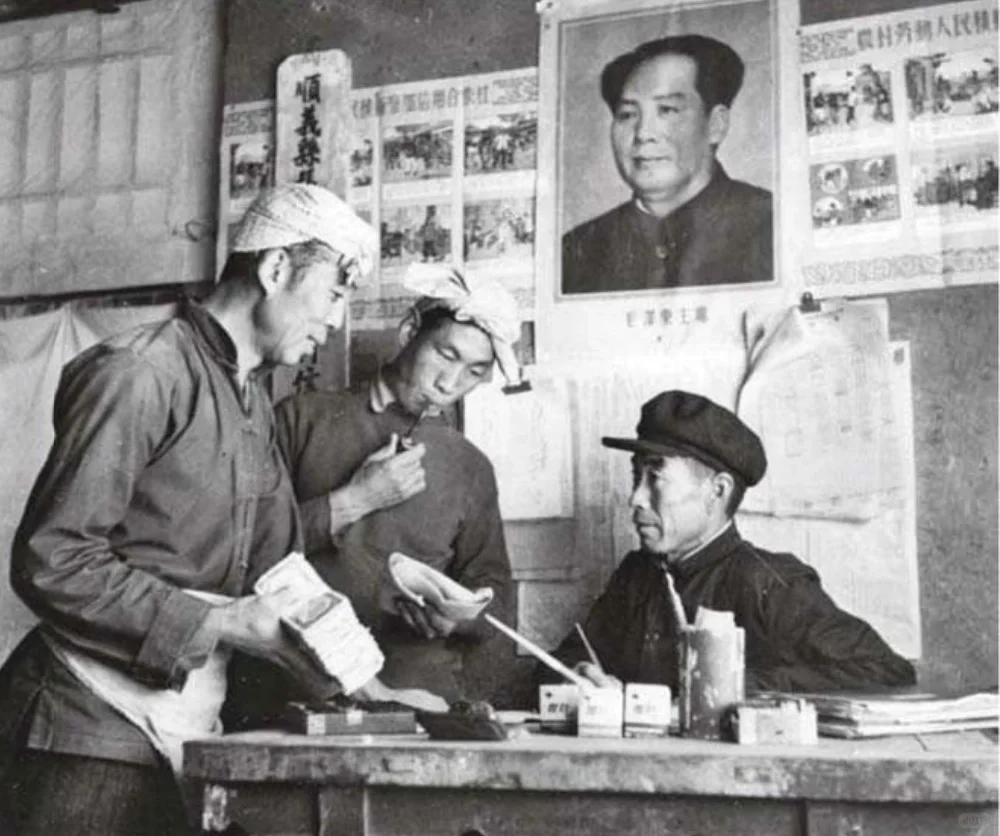 图2:1953年实行粮食“统购统销”政策,农民们卖余粮后,把钱存入信用合作社