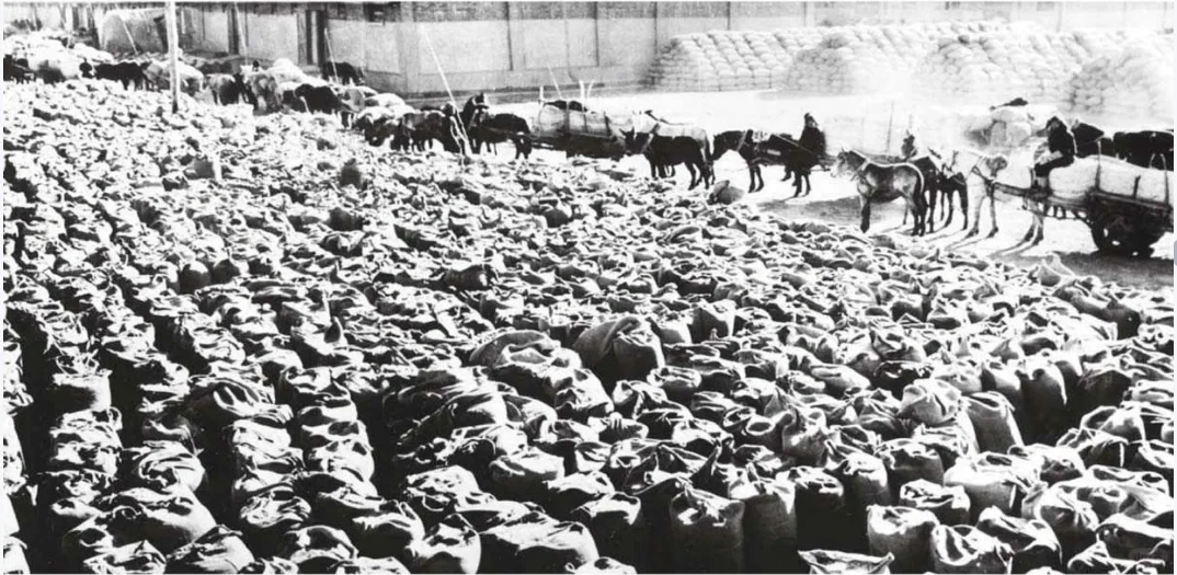 图5:内蒙古自治区哲里木盟,1964年比1963年多向国家提供商品粮一亿多斤。图为各公社的送粮大军正源源到达粮库