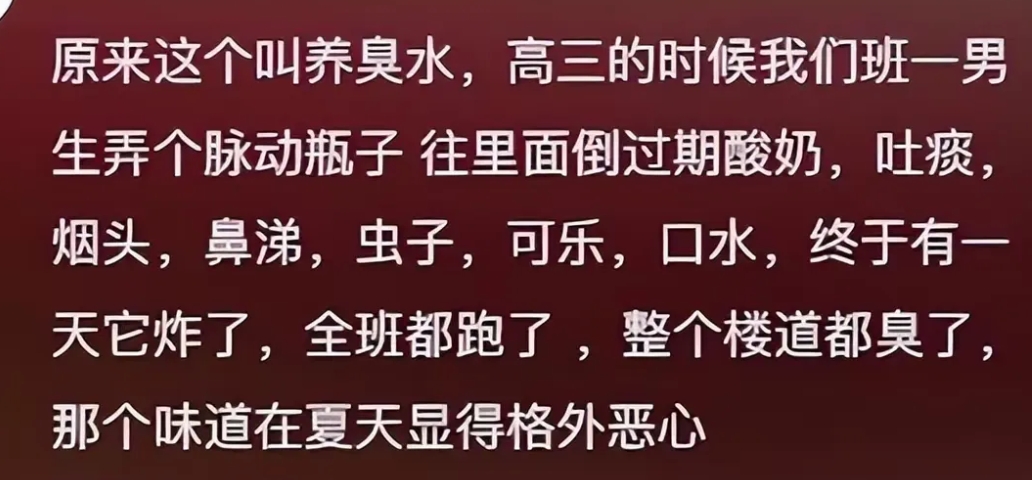 玩烟卡的游戏,我忍了,可“养臭水”在中小学流行起来,我实在接受不了啊!! 他们热衷于钻研各种看似荒诞的配方,将唾液、牛奶、蟑螂、苍蝇、蚊子、老鼠尾巴、生猪肉、护手霜等毫不相干的原料放入饮料瓶中,期待这些混合物在瓶子里发酵一段时间后能带来惊喜。真是这样吗?