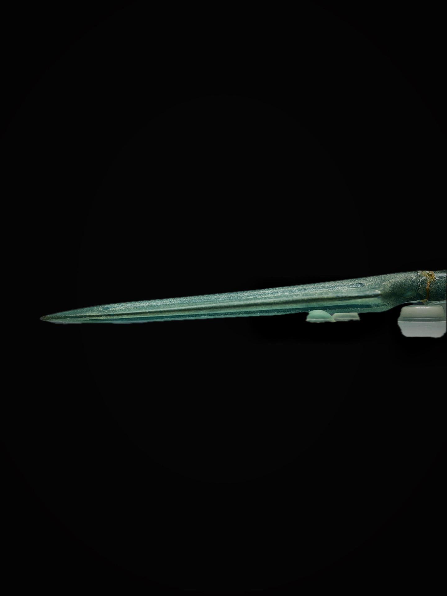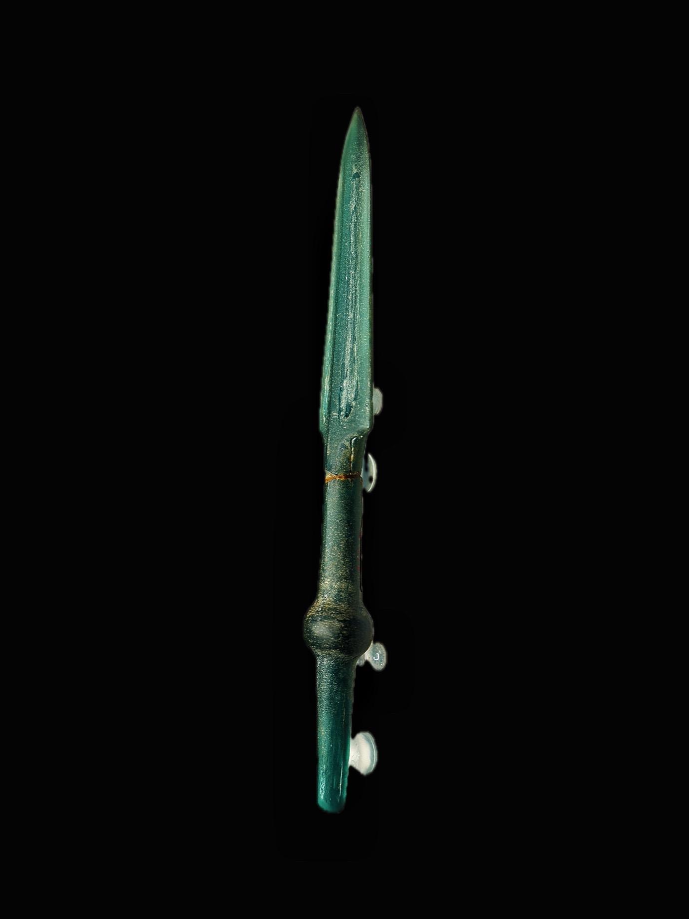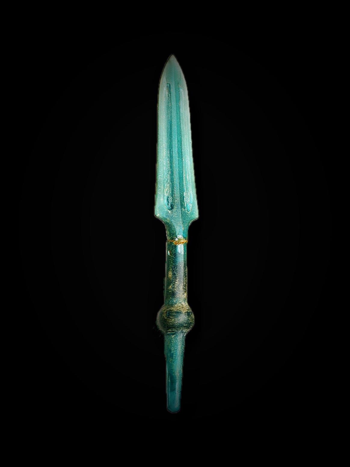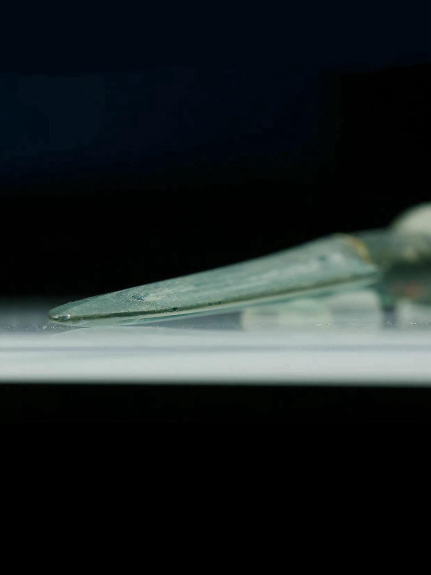这件翠绿色的矛由玻璃铸造,长18.8厘米、刃宽2.2厘米,1956年湖南长沙市沙湖桥M45出土,湖南博物院藏