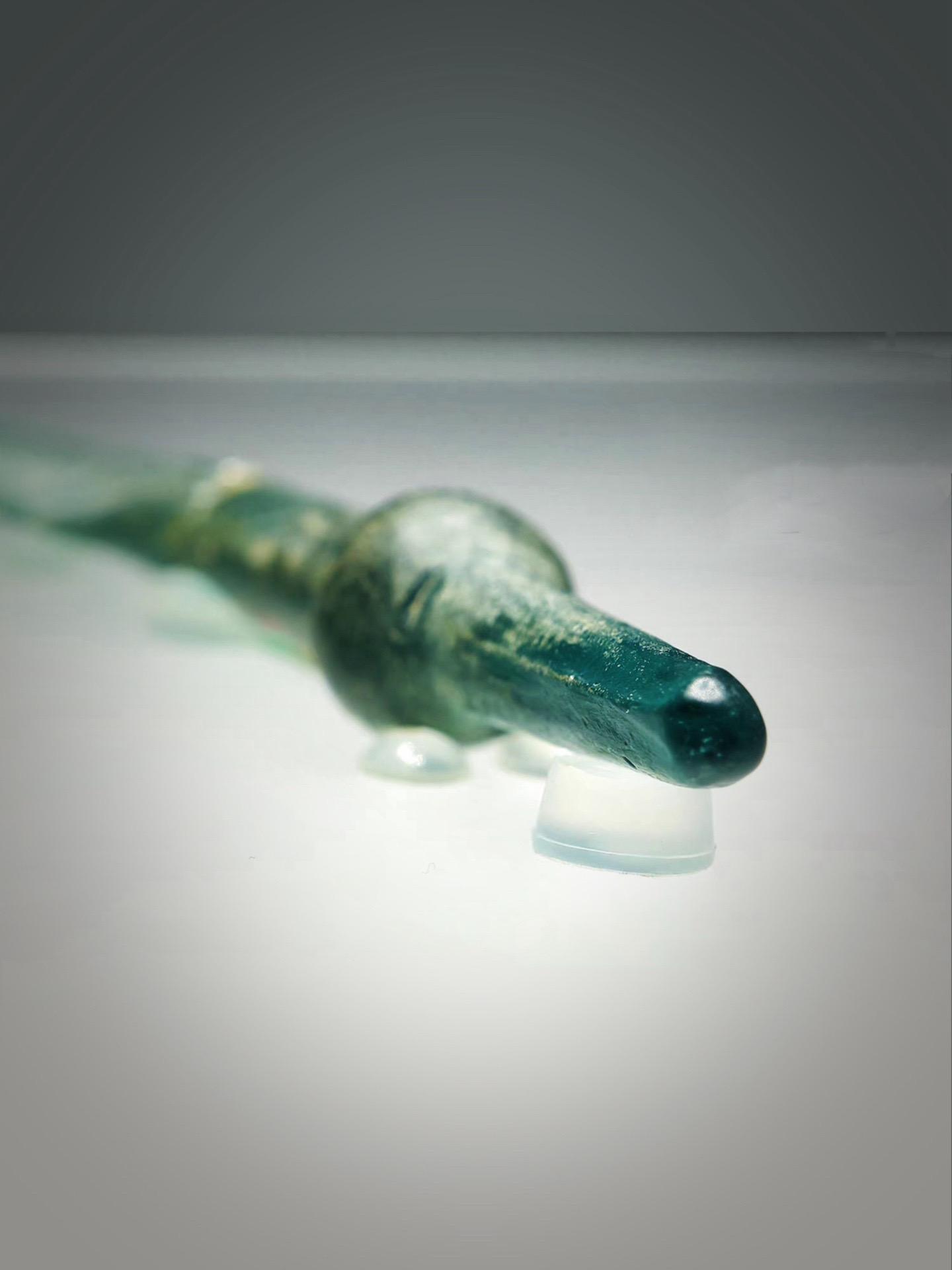 通体透明,矛脊两侧有槽,矛柄作圆柱状,柄的中部凸起成圆球形