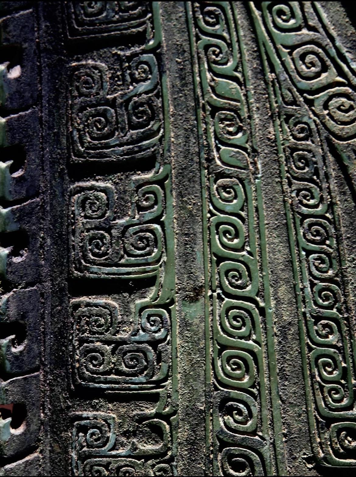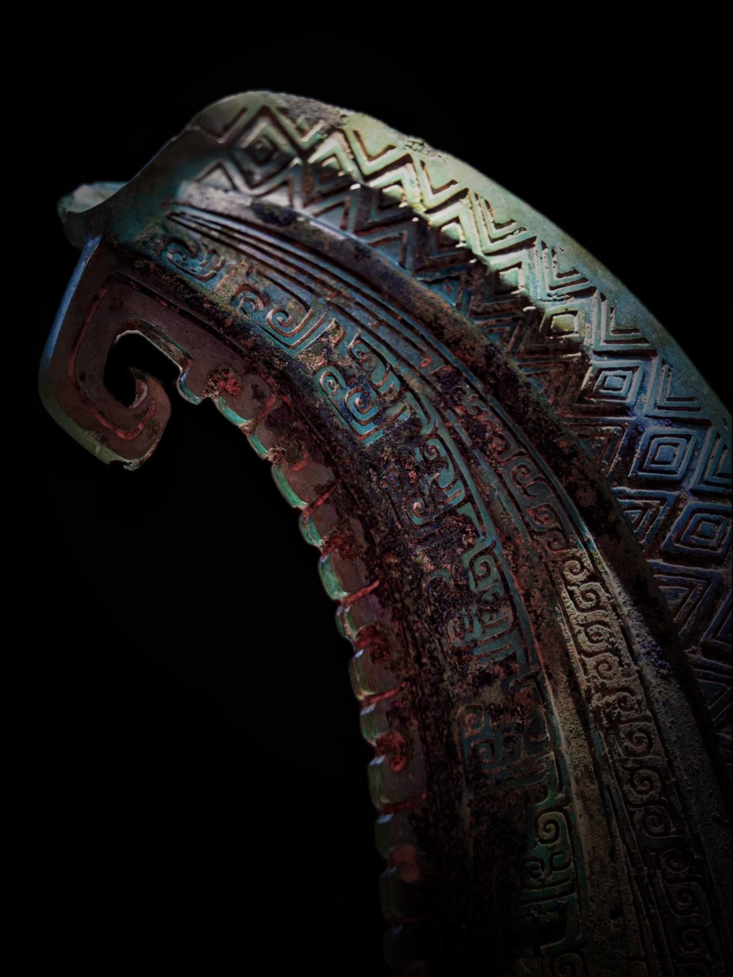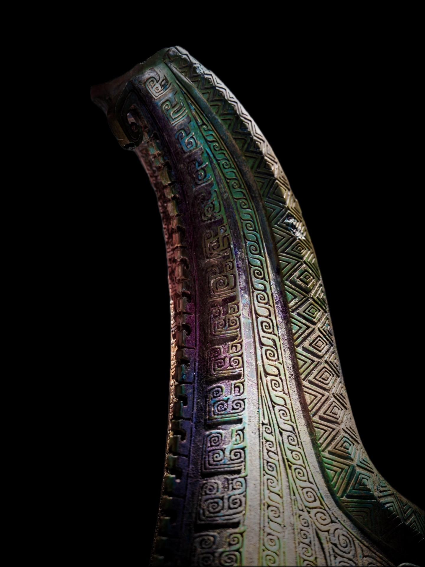 外侧刻有龙首、兽面和一只蝉,还有四条常见于南方青铜器