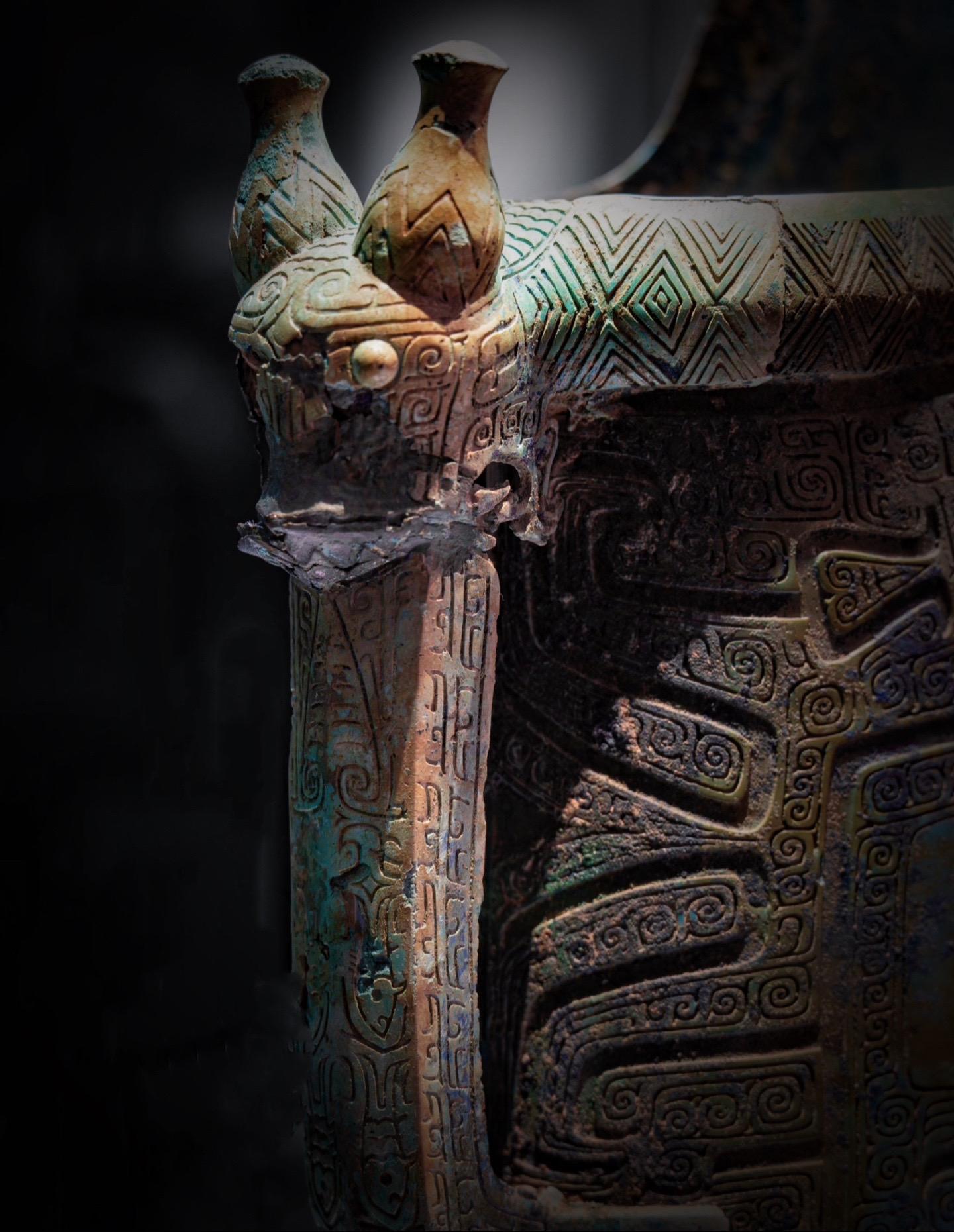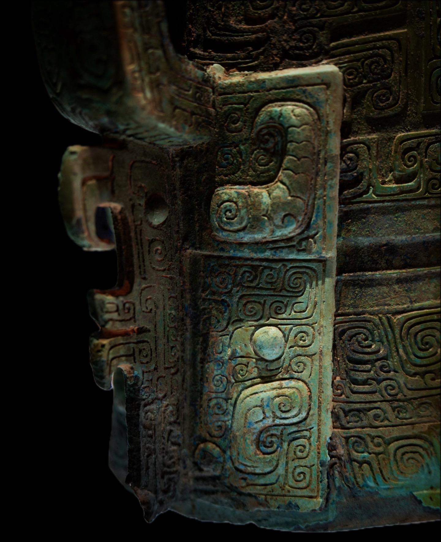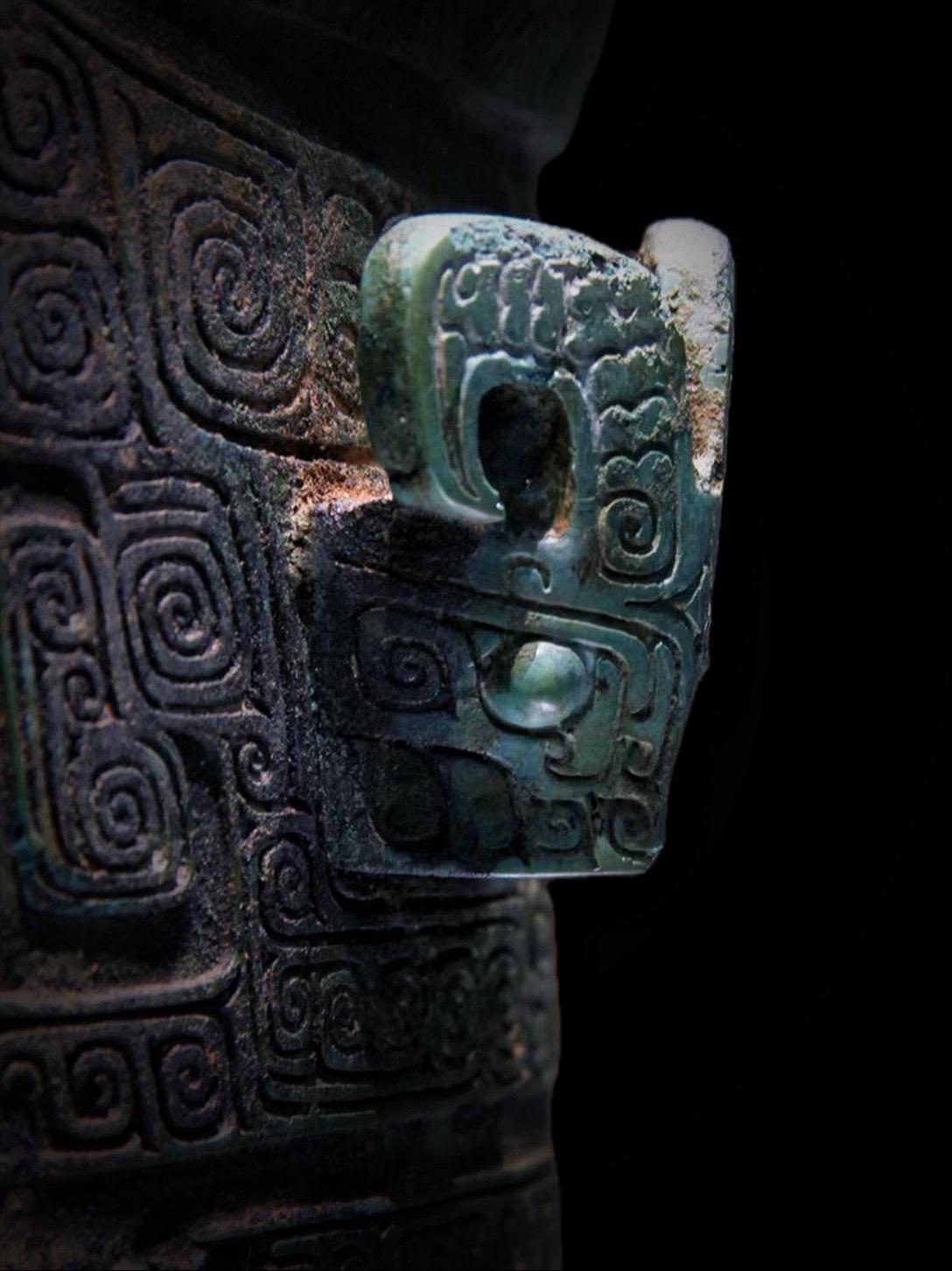 外侧刻有龙首、兽面和一只蝉,还有四条常见于南方青铜器