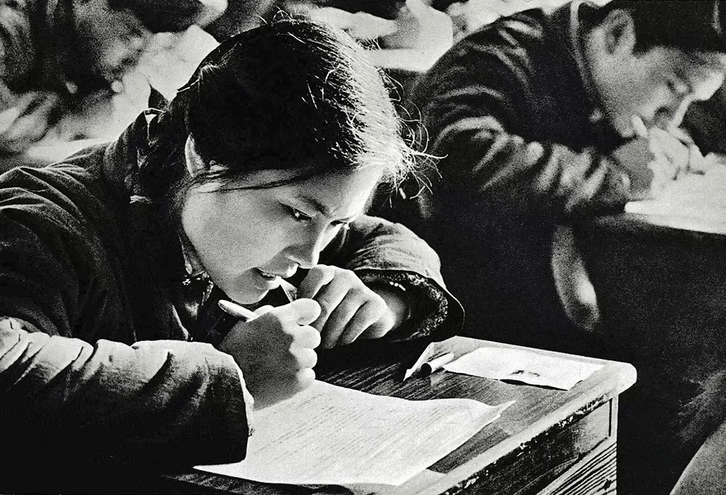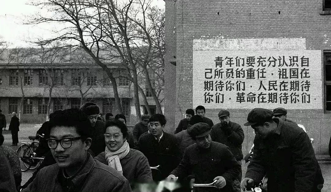 图1图2:1977年 恢复高考第一年的高考考场上 图3:1977年,我国恢复高考。图为北京高考考点外的标语。