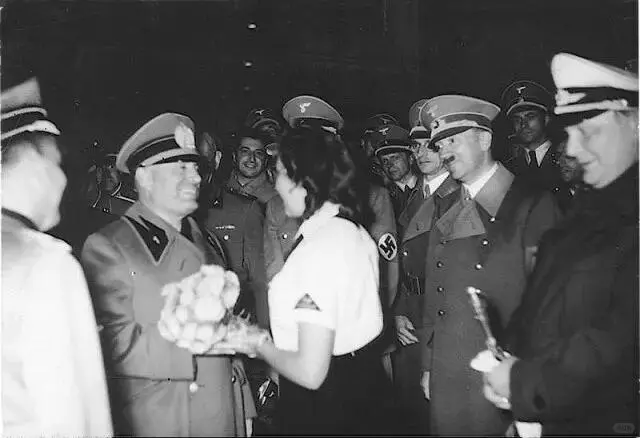 图9:1938年9月30日,一名德国少女联盟成员在慕尼黑车站向墨索里尼献花。右一为赫尔曼·戈林,右二为小胡子