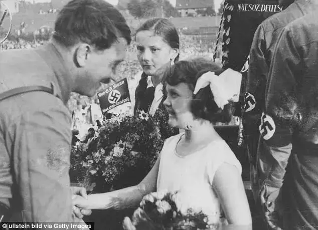 图6: 1936年,小胡子在纳粹党代会上会见一名年轻的德国少女。一位前少女联盟成员回忆她接受小胡子会见时“膝盖直发抖”,并将其比作现代女孩见到自己最爱的偶像