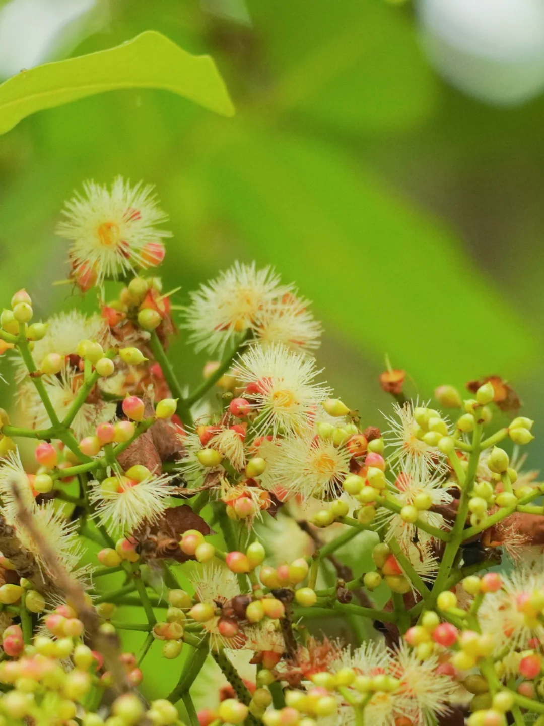 水翁蒲桃,和我们熟知的水果莲雾是亲戚,等这些小白花授粉完成后,便会长出一颗颗小拇指盖大小的红色果实。