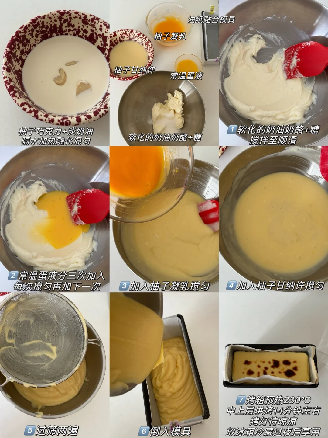 柚子巴斯克面糊比平常巴斯克面糊要浓稠些,高温快烤,烘烤时间会较短,一定得用可生食鸡蛋。烘烤时间久质地和口感也会变渣,柚子的酸会使蛋白质凝固造成油水分离的情况。柚子巴斯克适合软心或者流心的质地,切记不要烤过,不然口感会很难吃[扯脸H]