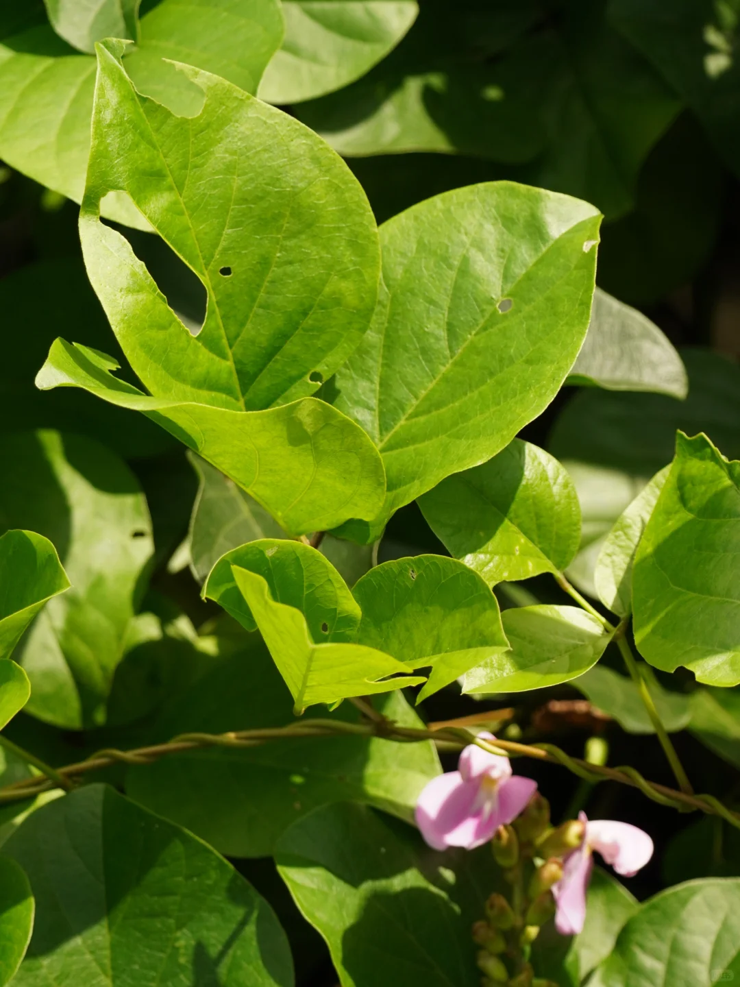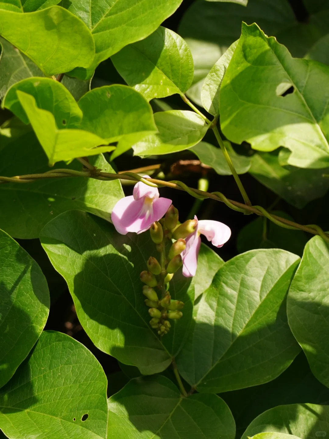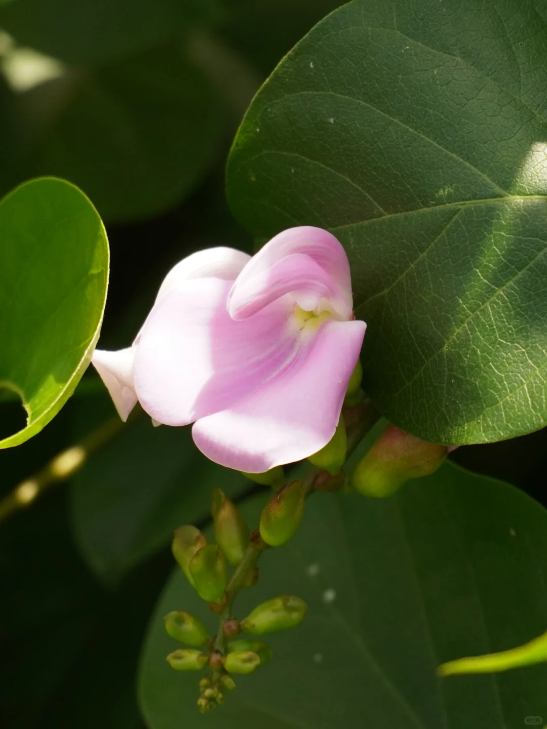 海刀豆的花是蝶形花,拥有旗瓣,翼瓣和龙骨瓣,其中龙骨瓣和翼瓣环抱在一起,紫红色的花组成了总状花序,俏丽的立在一丛丛绿叶间。