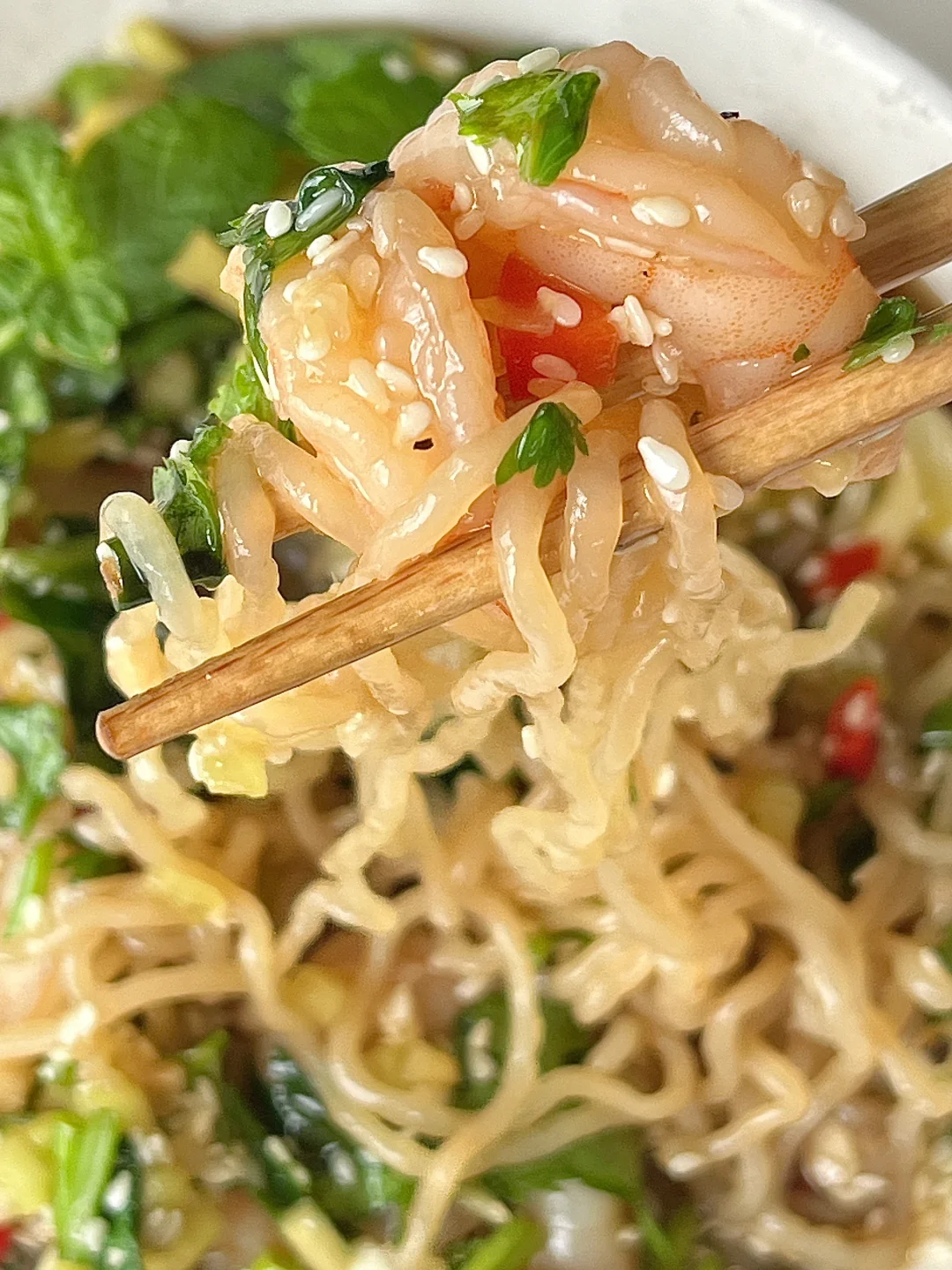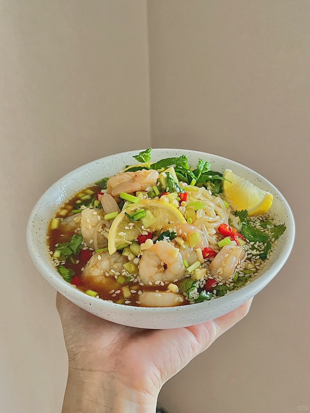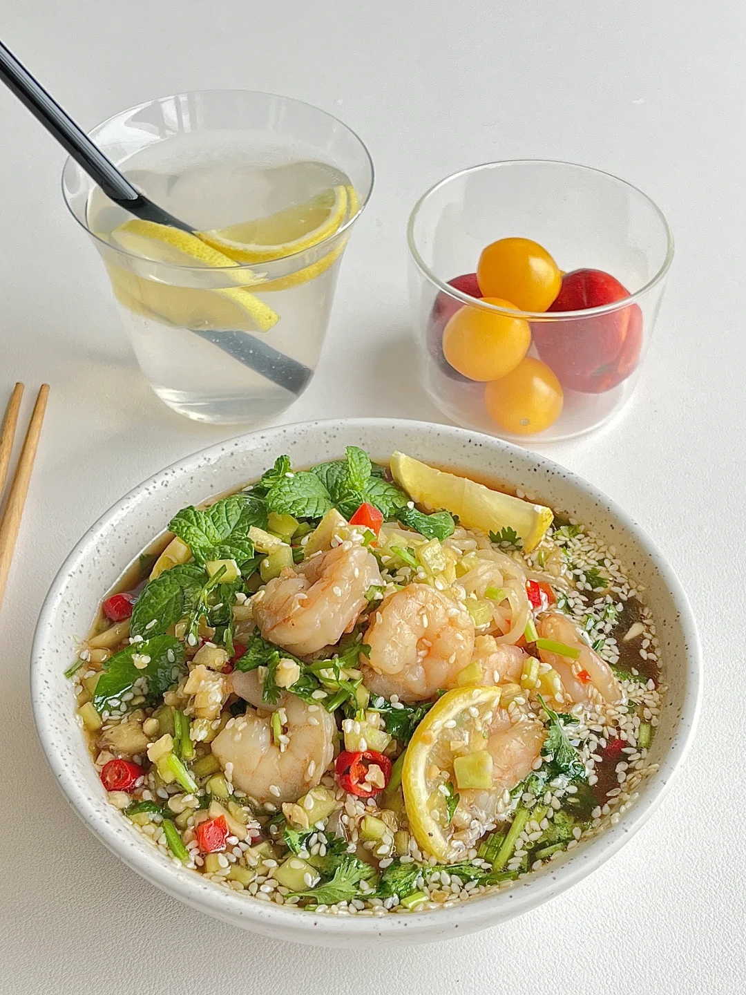 虾仁|柠檬|魔芋面|葱姜蒜|小米辣|薄荷|黄瓜|熟芝麻|花生碎
