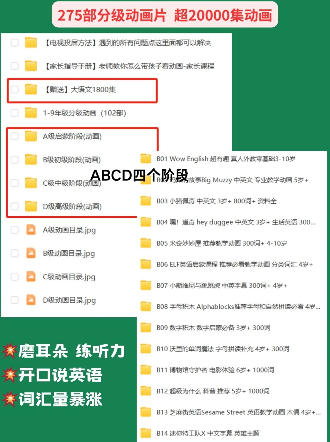 按照ABCD分阶段整理,分别适合不同阶段的年龄观看学习,为孩子初步排查一些不适合观看的动画片。