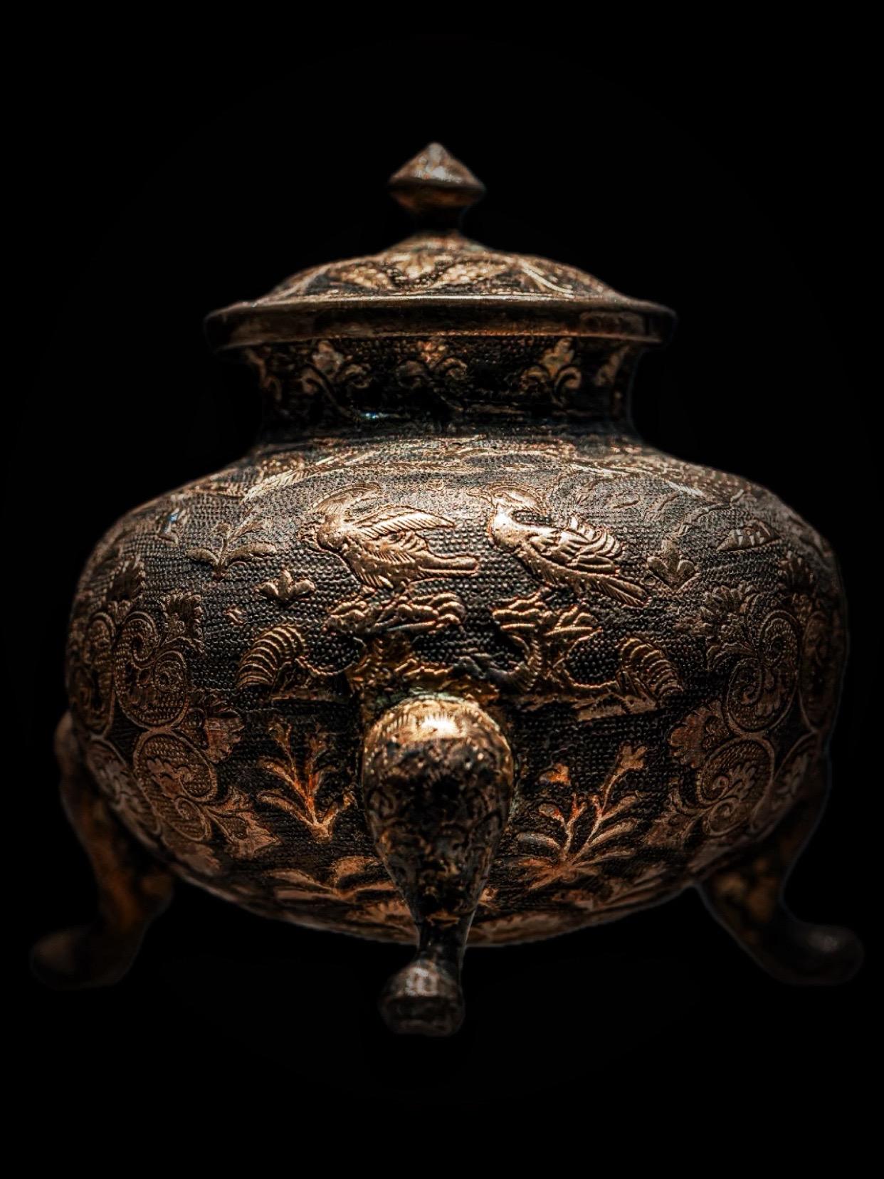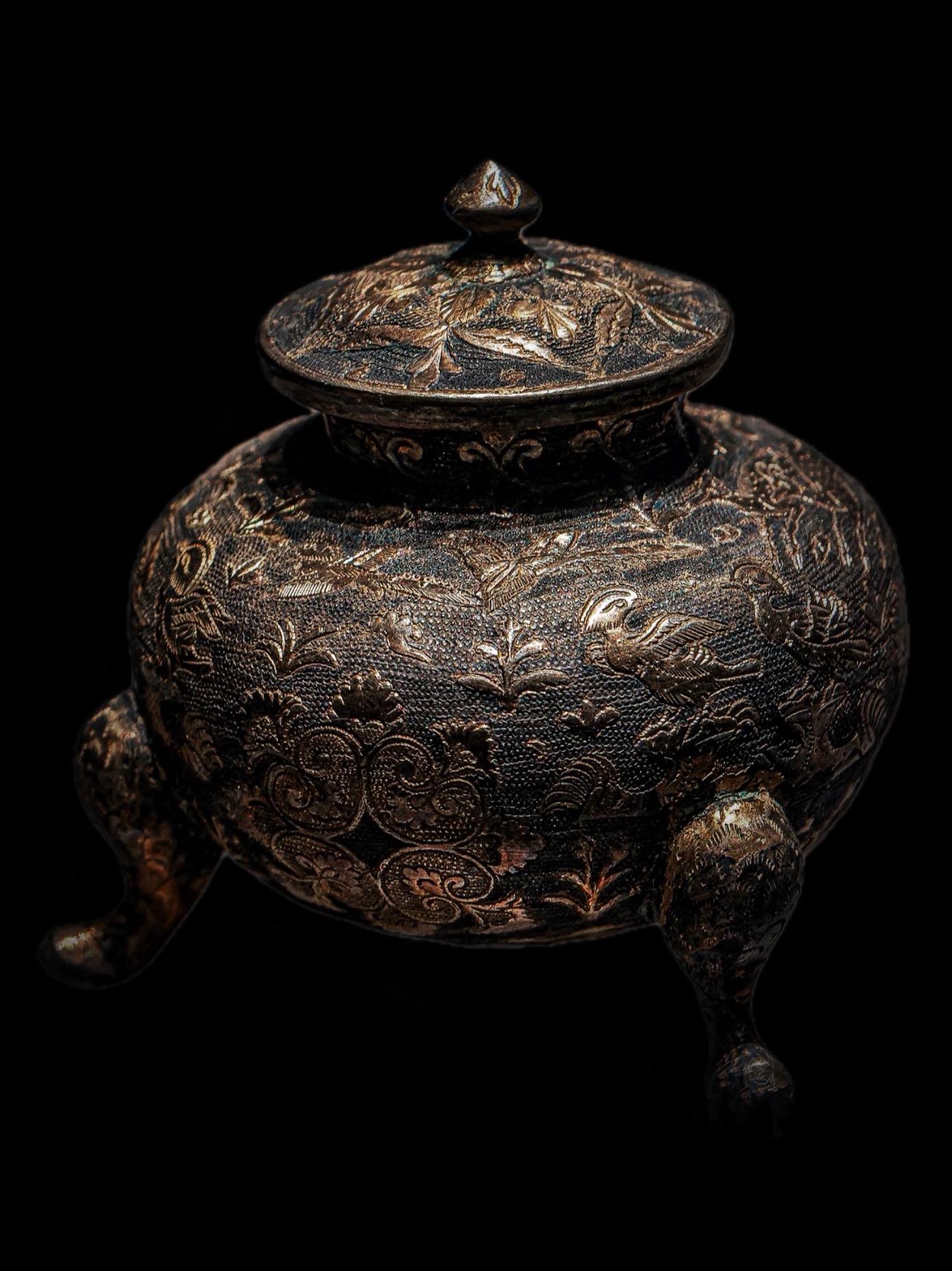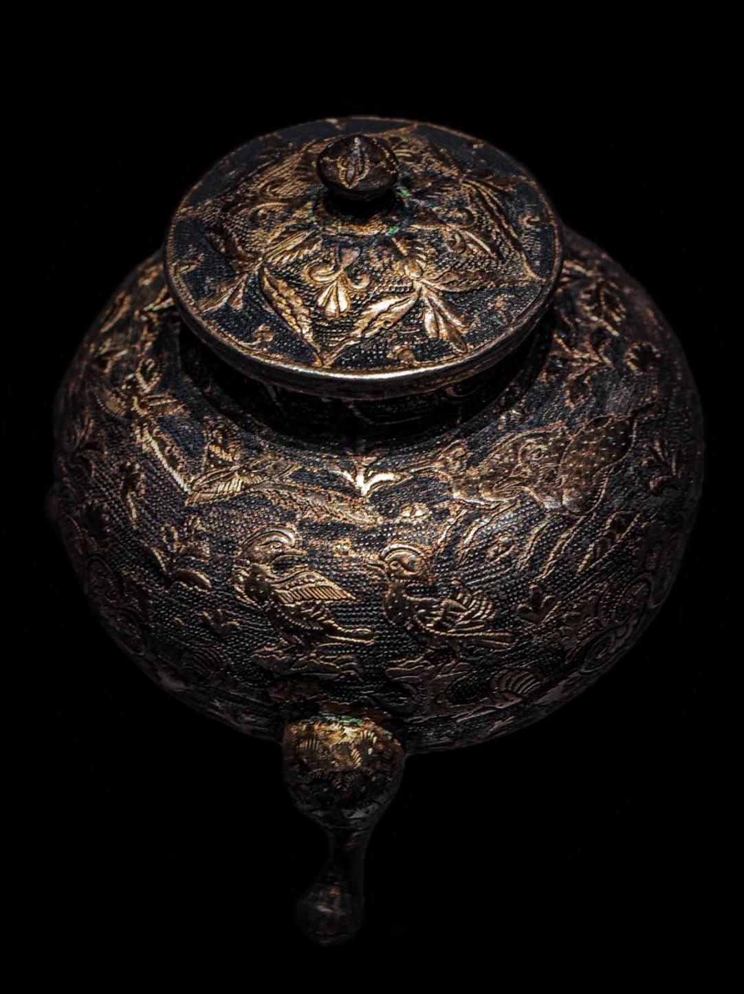 唐代 · 花鸟纹鎏金三足银罐。钟鼓馔玉不足贵,但愿长醉不复醒——唐·李白《将进酒》