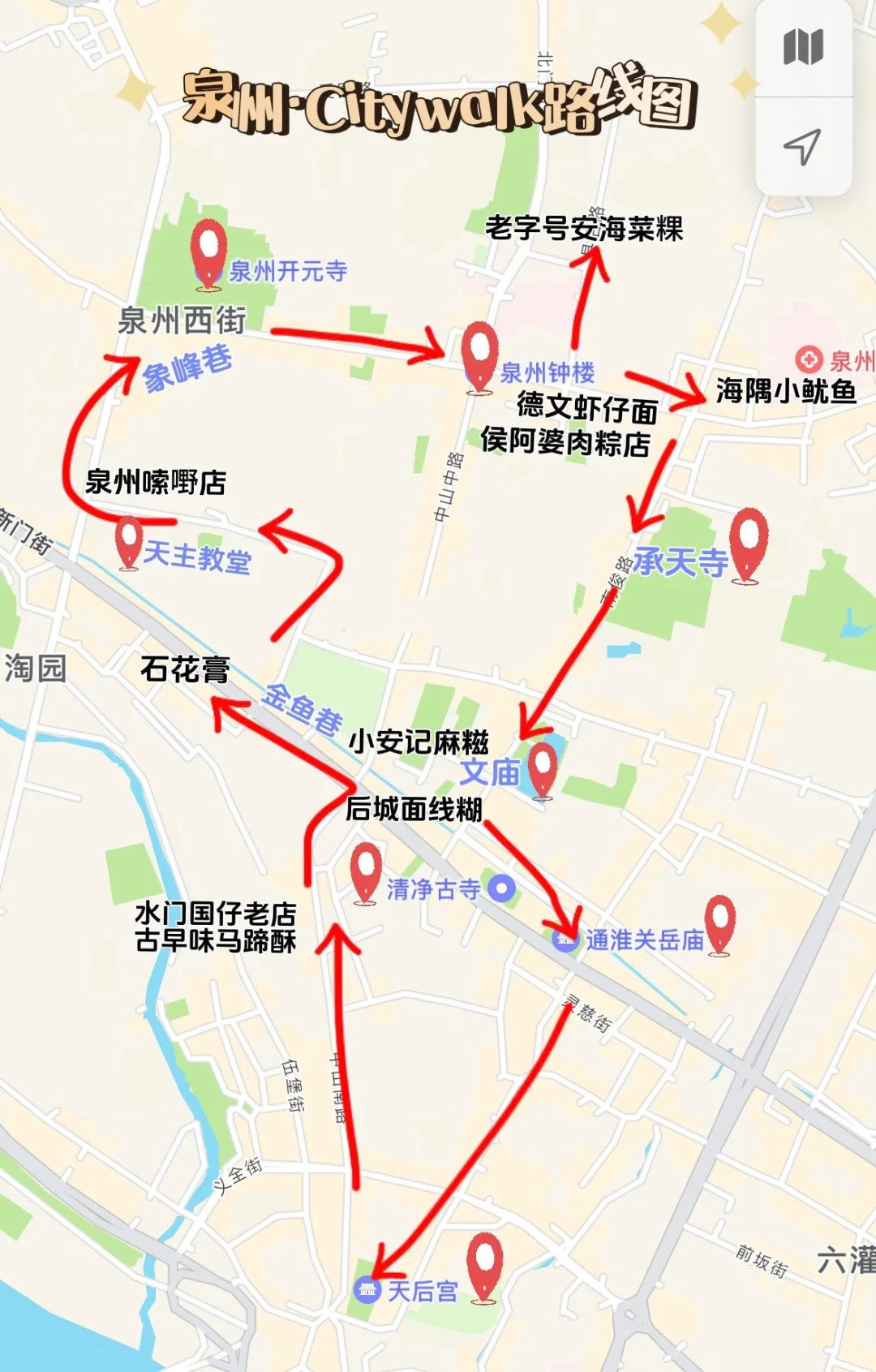 开元寺➡️西街➡️钟楼➡️承天寺➡️文庙➡️关岳庙➡️天后宫➡️清净古寺➡️天主教堂➡️开元寺