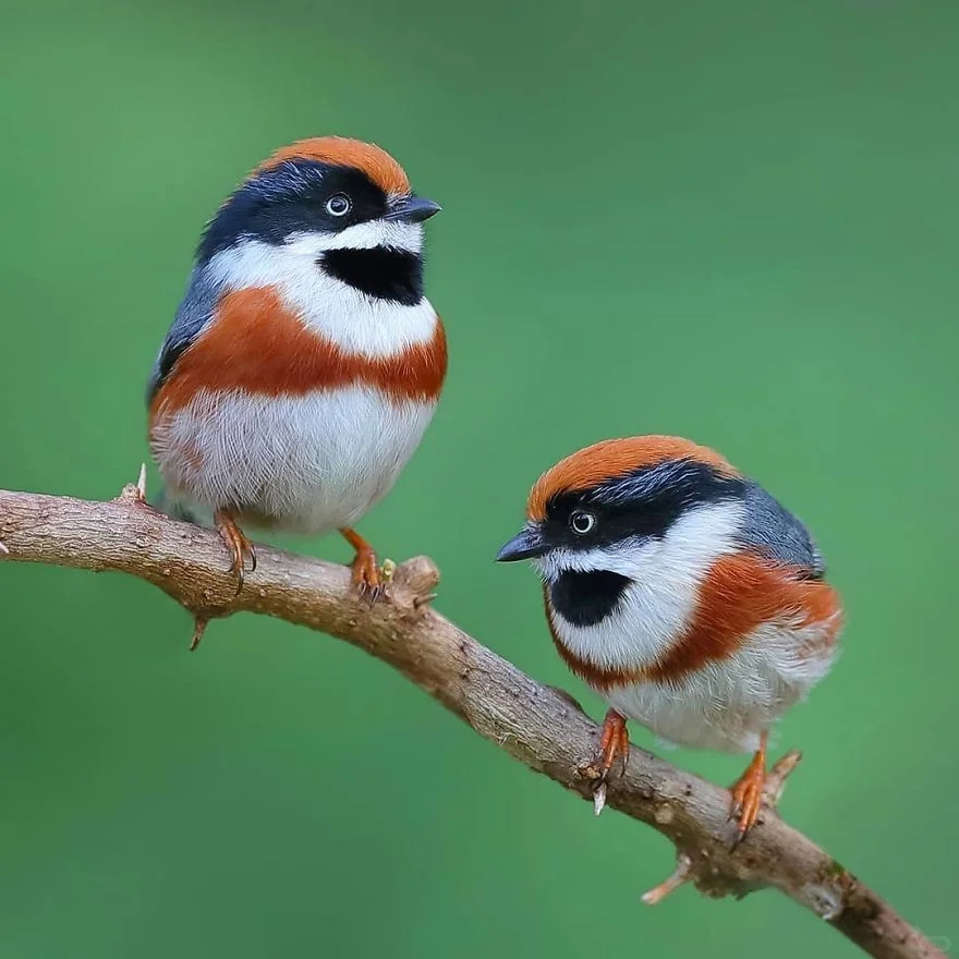 🍀形态特征:红头长尾山雀成鸟额、头顶至后颈栗红色,眼先、头侧和颈侧黑色,有的具白色眉纹;上体余部蓝灰色,腰部缀棕色羽缘;飞羽黑褐色具蓝灰色羽缘;尾黑褐色缀蓝灰色,外侧3对尾羽具楔形白色端斑,最外侧尾羽外翈白色;下体颏、喉至颈侧基部白色,喉中央具一大黑斑,其余下体白色为主,具一栗色宽胸带,两胁和尾下覆羽亦染栗色;虹膜橘黄色,喙蓝黑色,脚棕褐色。