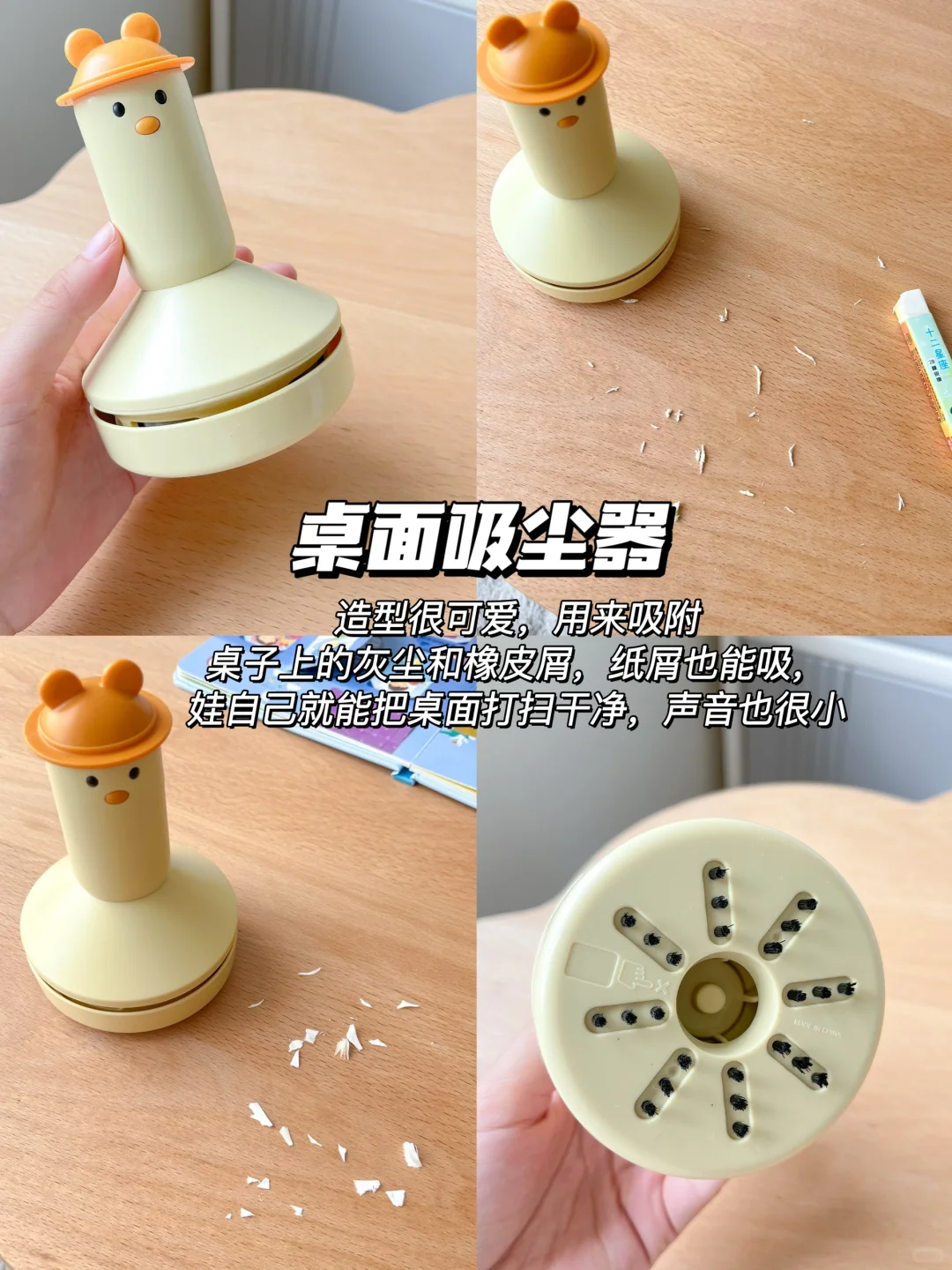 造型很可爱,用来吸附桌子上的灰尘和橡皮屑,纸屑也能吸,娃自己就能把桌面打扫干净,声音也很小
