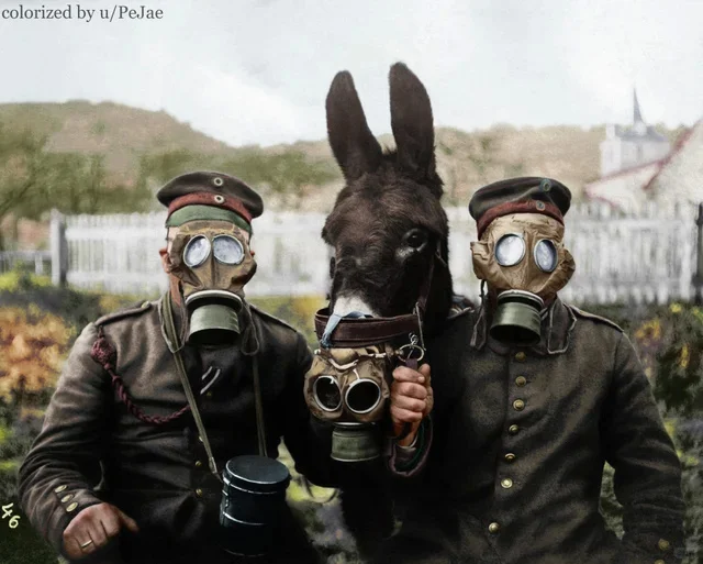 图1:1914年,一名戴着防毒面具的法军士兵和同样戴面具的军犬 图2:1916年,2个戴着防毒面具和德国士兵和同样戴面具的驴子合影 (后期上色) 图3:1917年9月27日,戴着防毒面具在战壕里的澳大利亚士兵(后期上色)