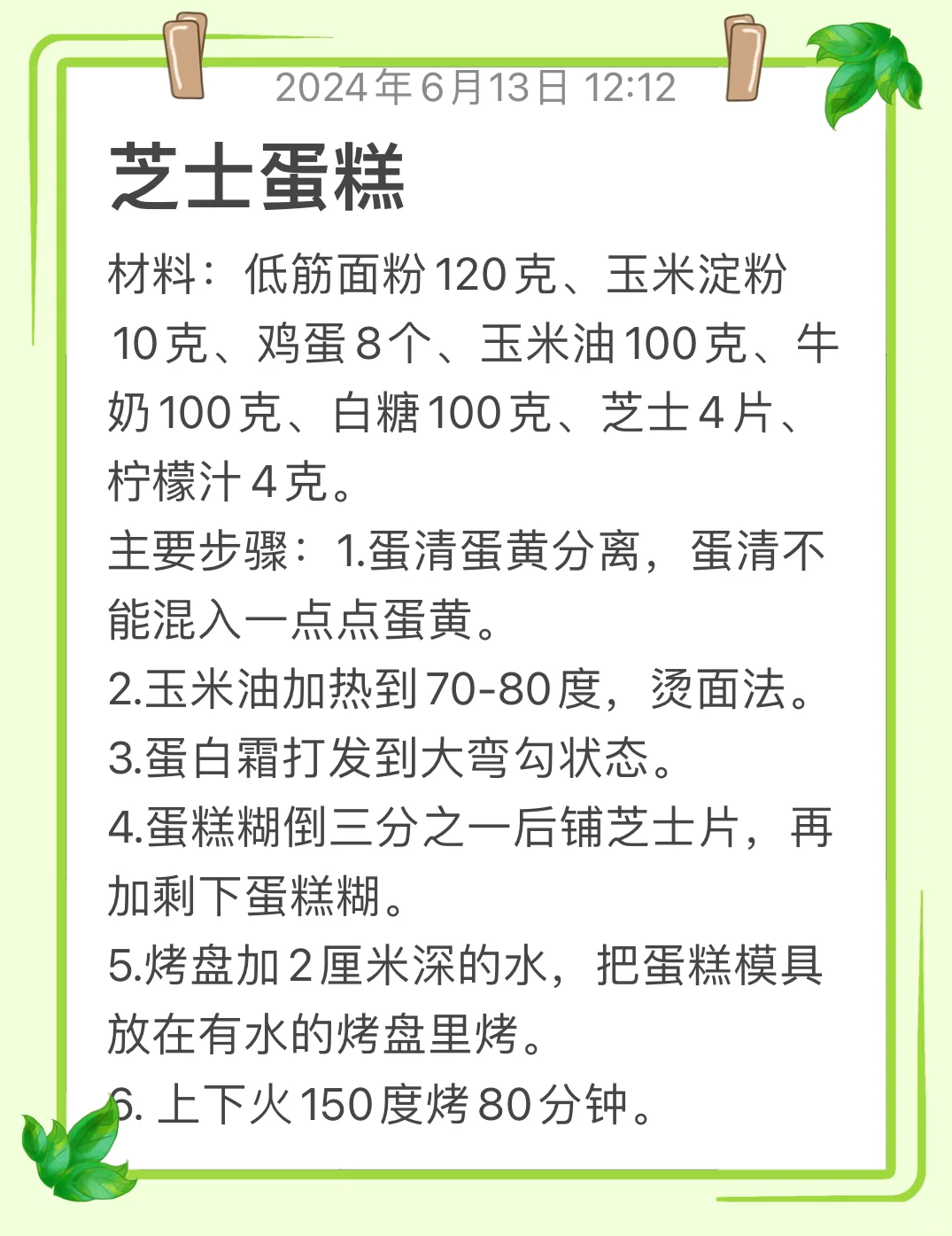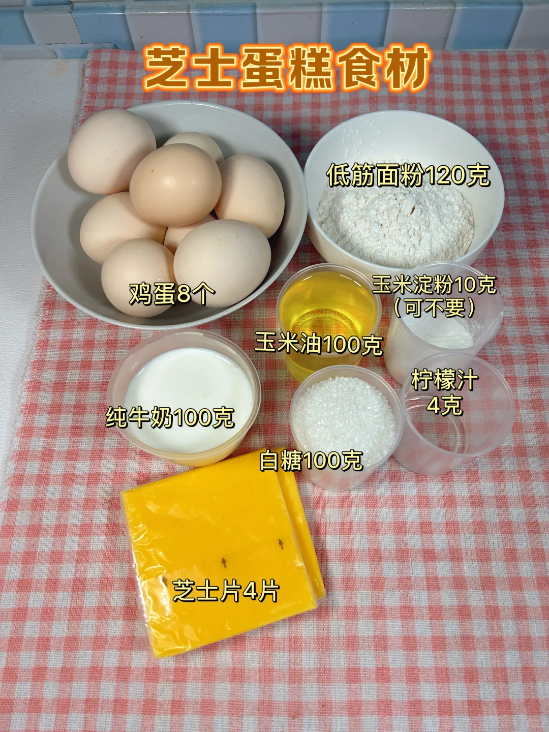 芝士蛋糕 材料:低筋面粉120克、玉米淀粉10克、鸡蛋8个、玉米油100克、牛奶100克、白糖100克、芝士4片、柠檬汁4克。 主要步骤:1.蛋清蛋黄分离,蛋清不能混入一点点蛋黄。 2.玉米油加热到70-80度,烫面法。 3.蛋白霜打发到大弯勾状态。 4.蛋糕糊倒三分之一后铺芝士片,再加剩下蛋糕糊。 5.烤盘加2厘米深的水,把蛋糕模具放在有水的烤盘里烤。 6. 上下火150度烤80分钟。
