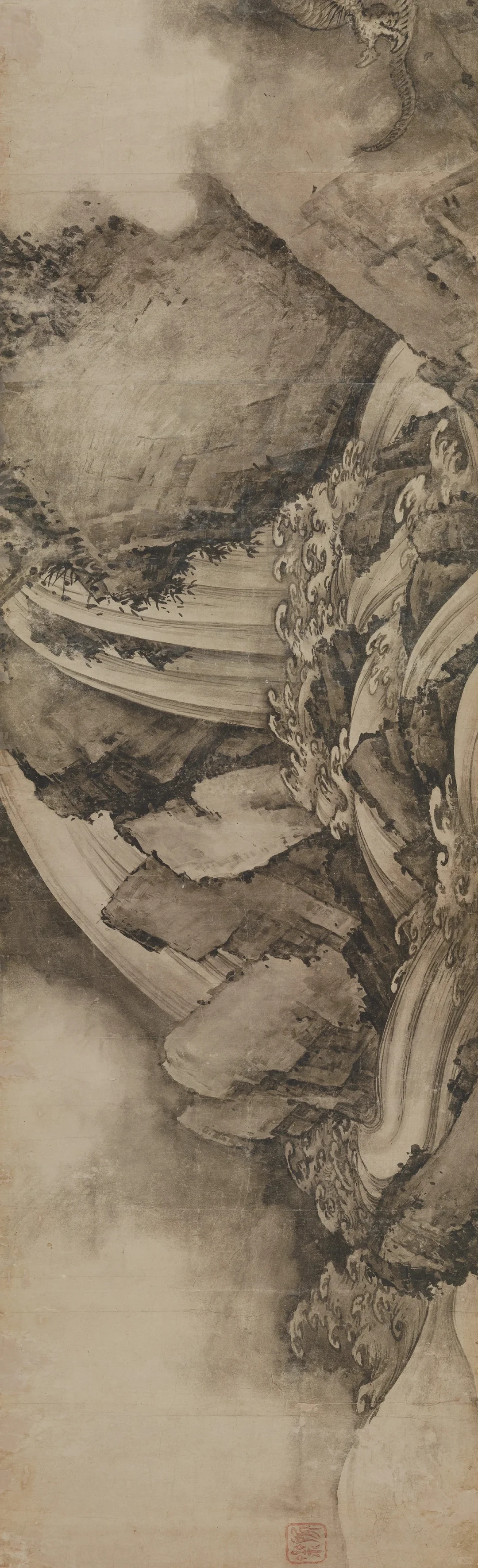 台北故宫博物院藏有一幅《霖雨图》,画中绘有一只巨大的龙首。以人的表情而言,龙首“白眼示人”,唇端微仰,一副轻蔑之态。龙身则升向画外,隐匿云雾之中,正谓之“神龙见首不见尾”。画面的下方留有画者题跋: