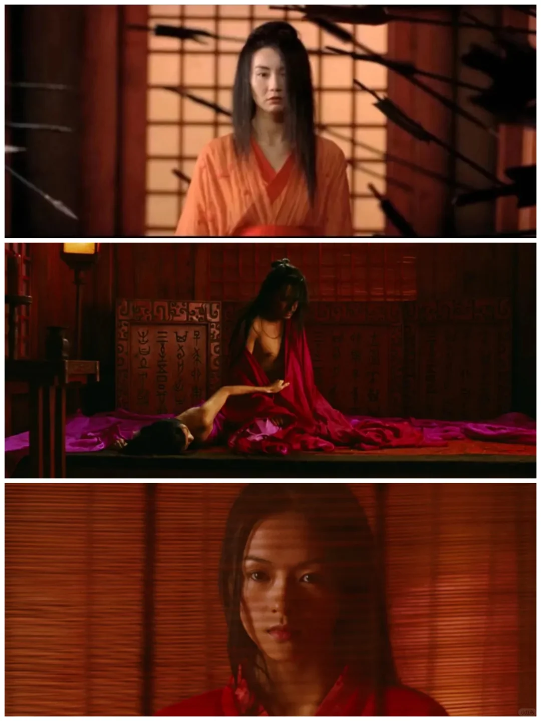 2,红黄搭配的场景,张曼玉饰演的飞雪和章子怡饰演的如月,在金黄色的胡杨林决斗。