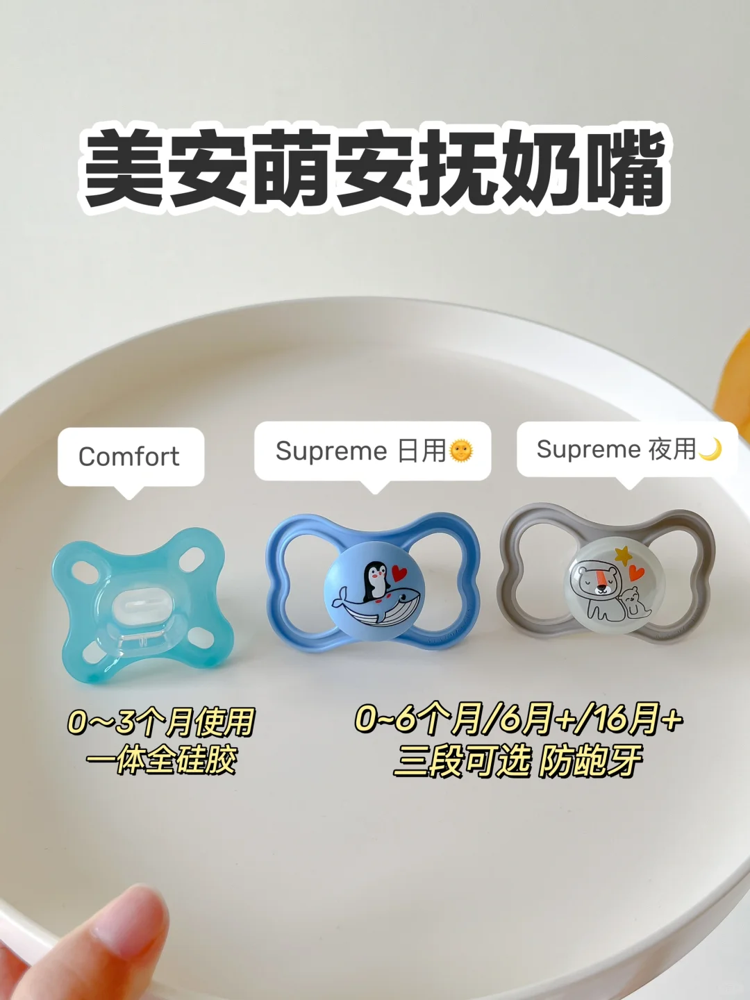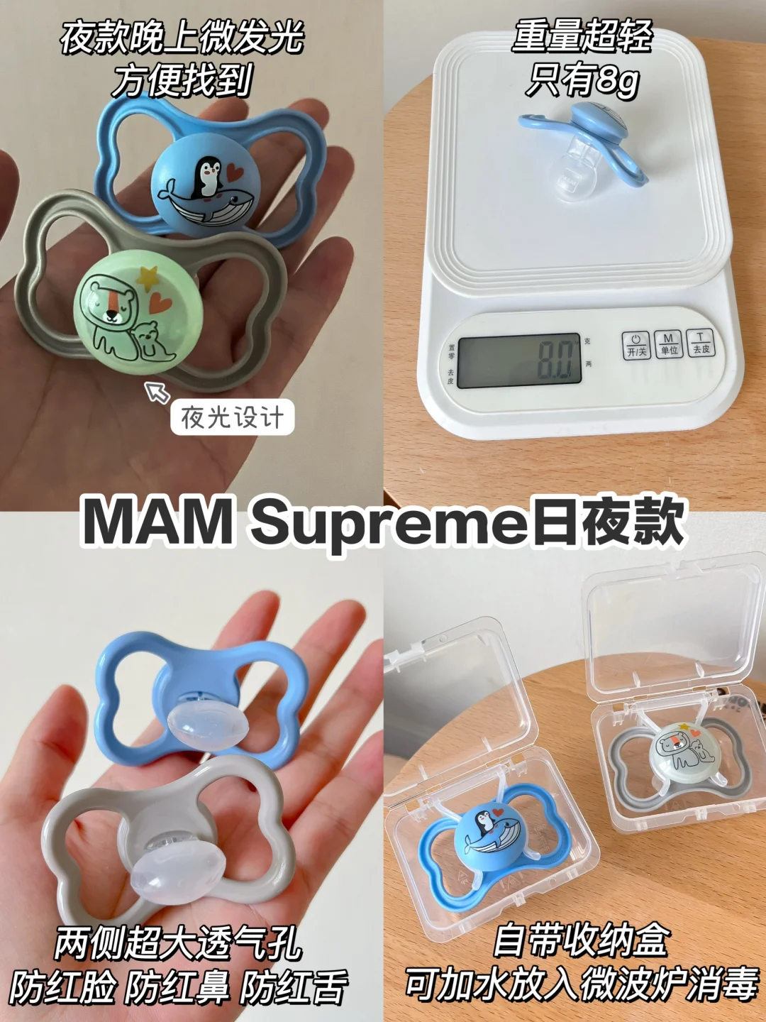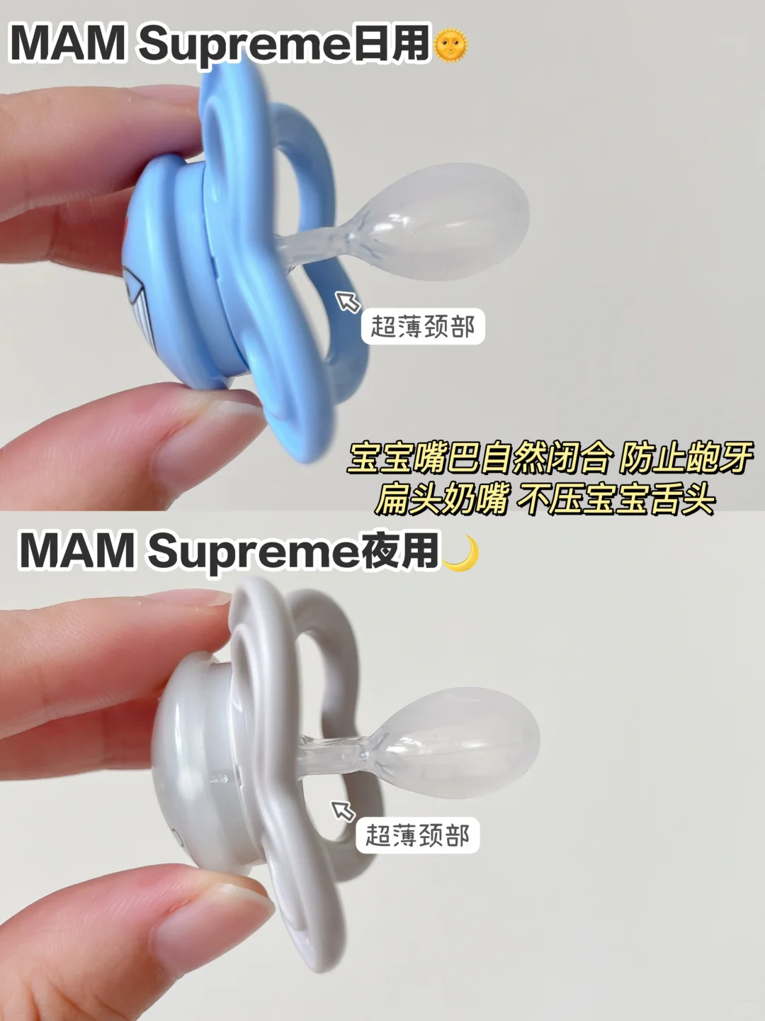 👉担心龅牙的姐妹选MAM Supreme,颈部超薄,扁头奶嘴,可以让宝宝嘴巴自然闭合,有利于口腔发育,防止龅牙,夜款有夜光设计,晚上宝宝醒了可以自己找到接觉,巨省妈,两侧超大透气孔弧形设计,防红脸红鼻,有0-6/6+/16+三段选择