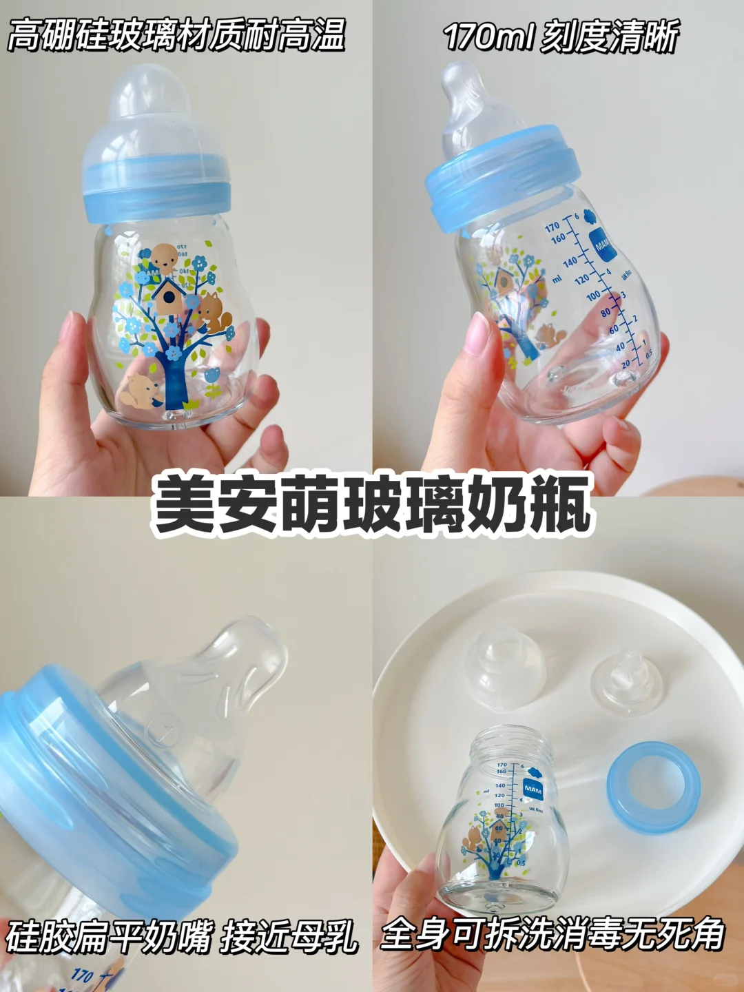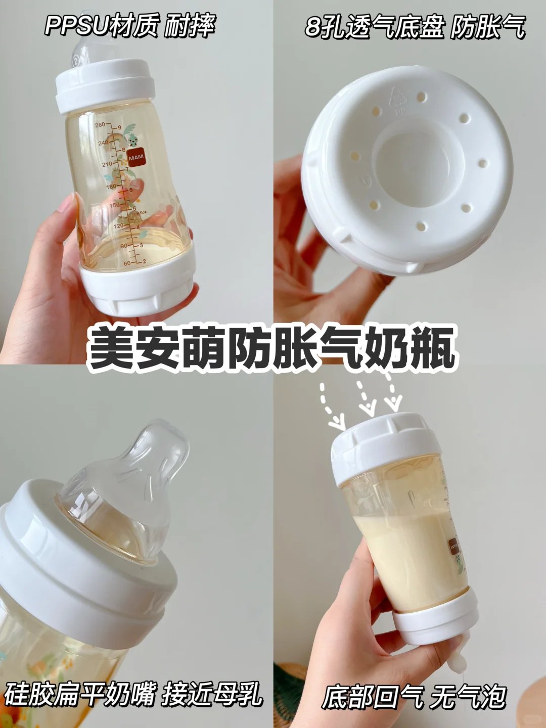 我家用的是美安萌玻璃奶瓶和防胀气奶瓶,它家奶瓶都是扁平奶嘴,更贴合口腔接近母乳真实形状,避免乳头混淆,它家防胀气奶瓶是双重防胀气,重点是底部8孔回气,空气不经过奶液,喝奶时不会产生气泡,防胀气真的一绝!!