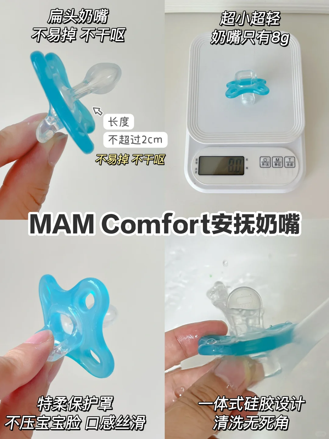 👉0~3个月用MAM Comfort,它更小更轻,适合新生儿不压宝宝脸,奶嘴长度不超过2cm,新生儿含住不容易掉,也不会干呕,一体式硅胶设计的,超级软又清洗无死角