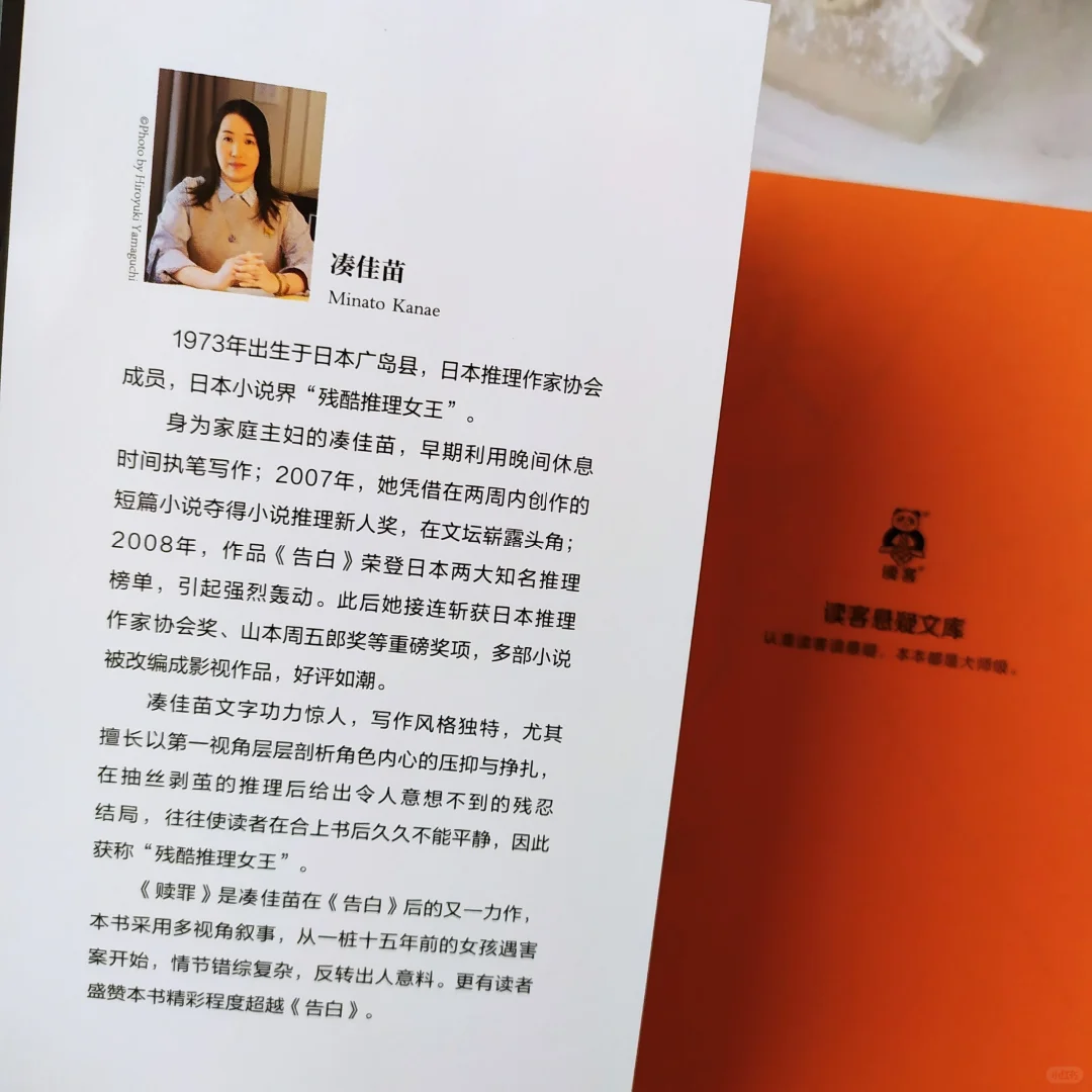 凑佳苗,她的作品都以对人性深刻的洞察和剖析而轰动推理小说文坛,她因此被日本推理小说界誉为“残酷推理女王”。凑佳苗成名并不早,在创作小说之前,她有丰富的社会历练,所以对一些问题可能比较透彻深邃。2007年凭借创作获得第29届推理小说新人奖后,才在文坛崭露头角。小说《告白》是她的长篇处女作,获得了日本书店大奖第一名及广岛文化奖。这本小说《赎罪》也入围了第63届日本推理作家协会奖。