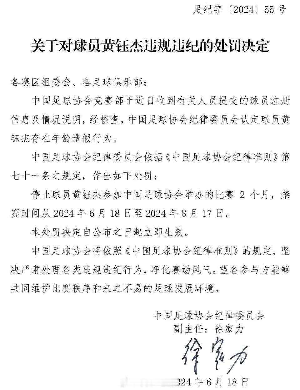 中国足协纪律委员会宣布,停止球员黄钰杰参加中国足球协会举办的比赛2个月,禁赛时间从2024年6月18日至2024年8月17日。本处罚决定自公布之日起立即生效。