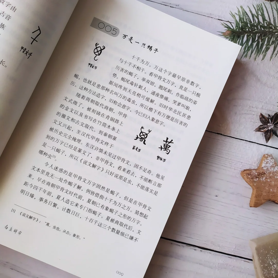 比如书中讲到我们认识的表示数目的“萬”字,我们怎么也不会想到,在甲骨文中,它最原初竟然指的是蝎子。蝎子尾巴上的毒针,扎人痛得当然特别厉害了。痛地哭爹叫娘。就是华北的民居患蝎,就是换这种叫“萬”的毒虫,所以屋檐下有万便是“厉”害的“厉”。作者说《说文解字》上说“萬”字代表一种虫子,当时不理解,但是看到了甲骨文上“萬”的字形后,便豁然了!
