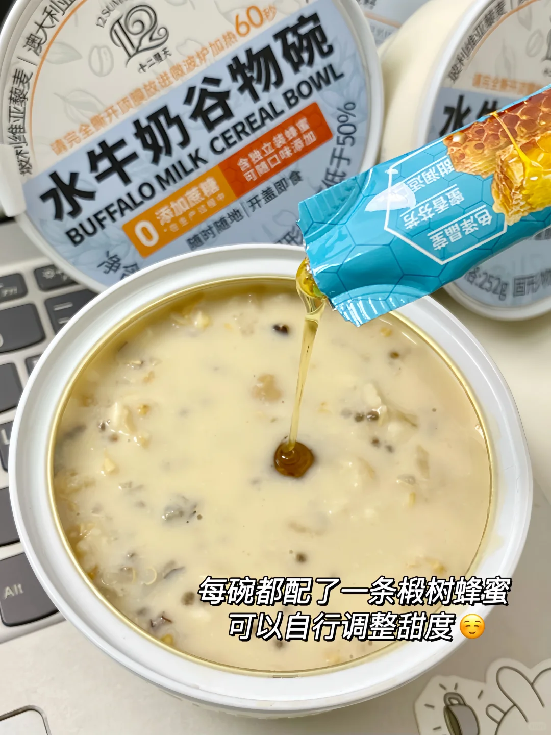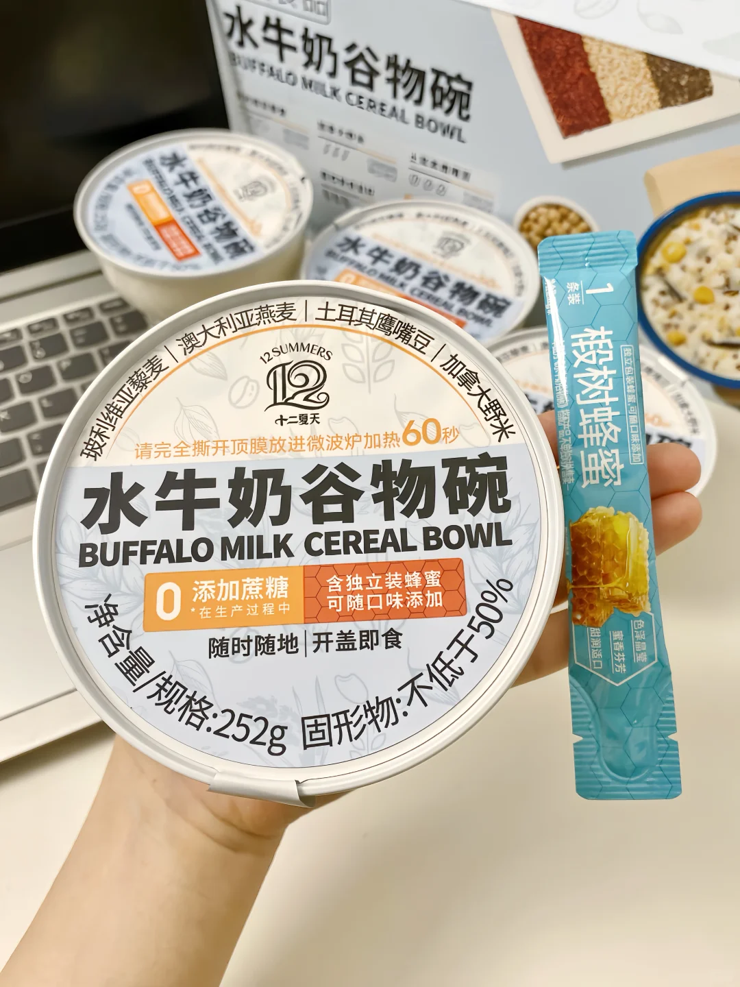 真没想到这玩意好吃就算了!!还是低卡低脂的! 十二夏天的水牛奶谷物碗!真的求求女孩子们都去试试! 免煮即食的超方便!配料都是健康干净的世界谷物! 每一口都能吃到超多料!各种藜麦、野米、鹰嘴豆、燕麦、奇亚籽🤤 0蔗糖的,口感软糯清甜的,好好吃!完全不会腻! 嗜甜姐妹也可以自行添加蜂蜜🍯进去 满满粗粮~这一碗饱腹感也是杠杠的!早上来一碗妥妥的!!