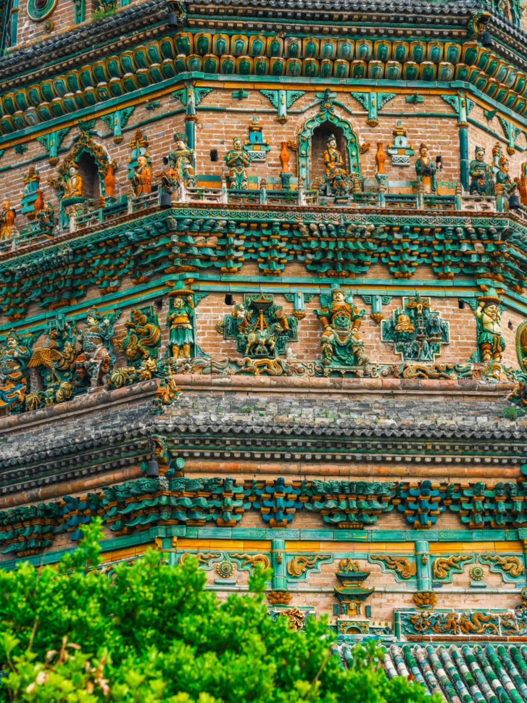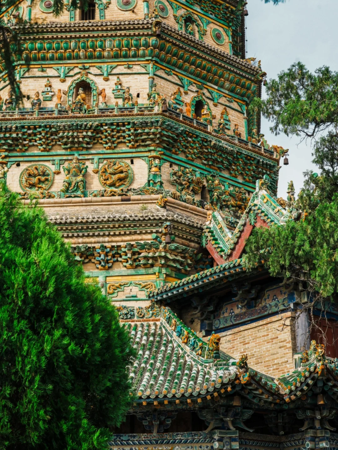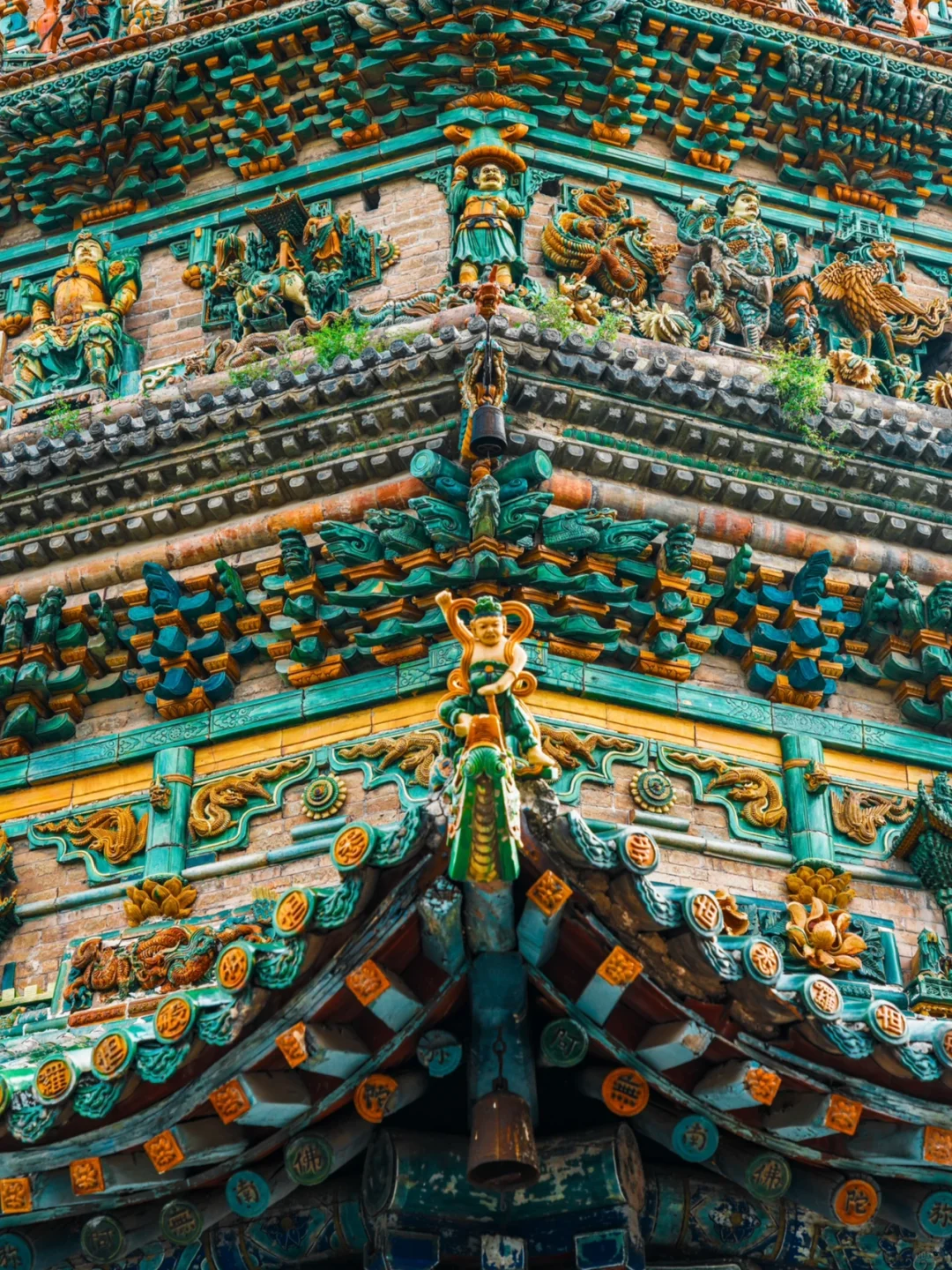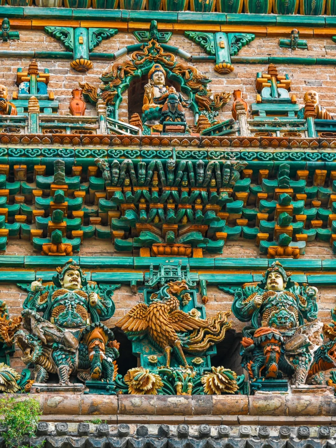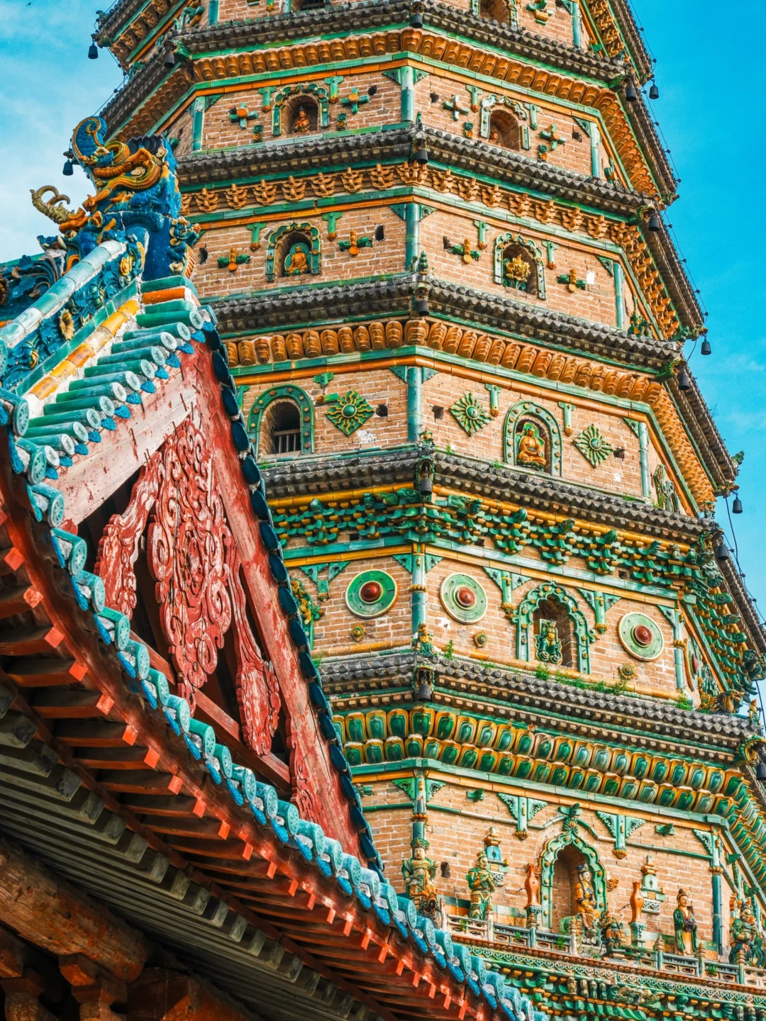寺内的飞虹塔建成于明嘉靖六年,塔高47.31米,塔身全部使用五色琉璃镶嵌而成,遍布各种琉璃人物与构件,层层叠叠,细节颇多,如同炫技一般