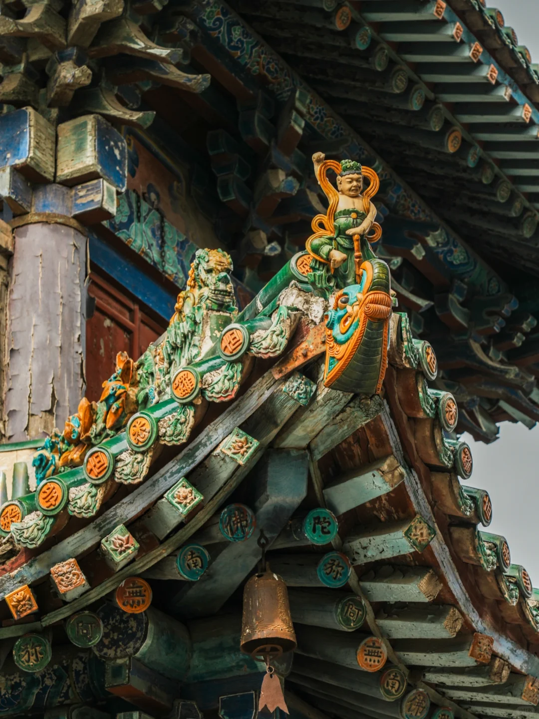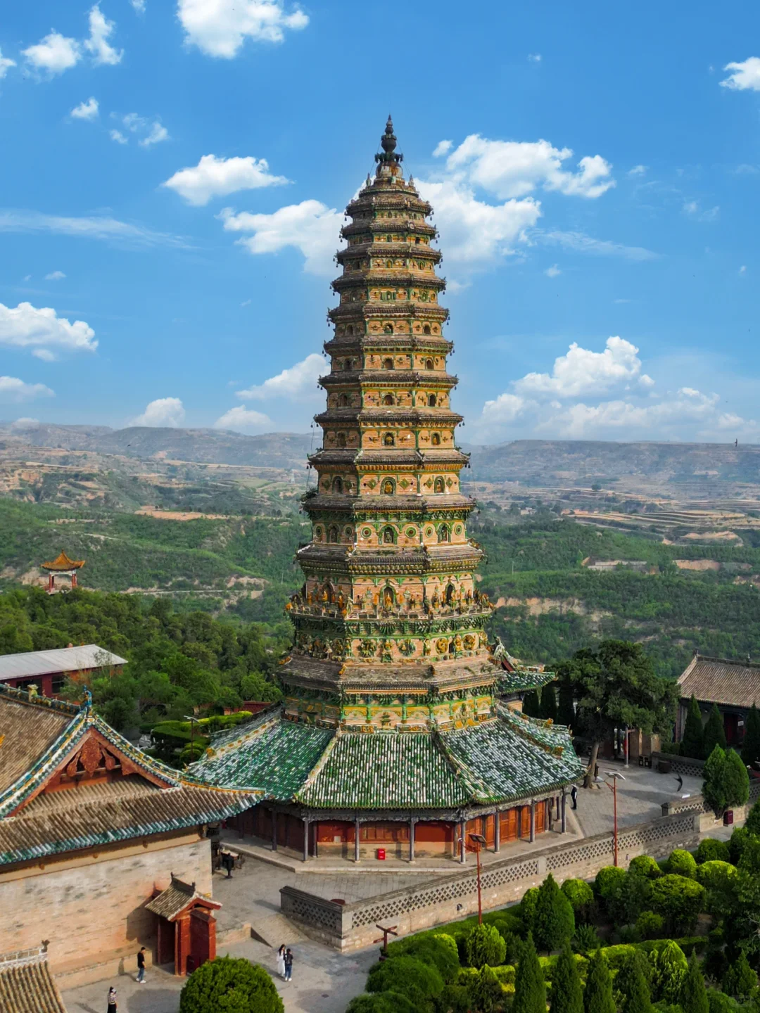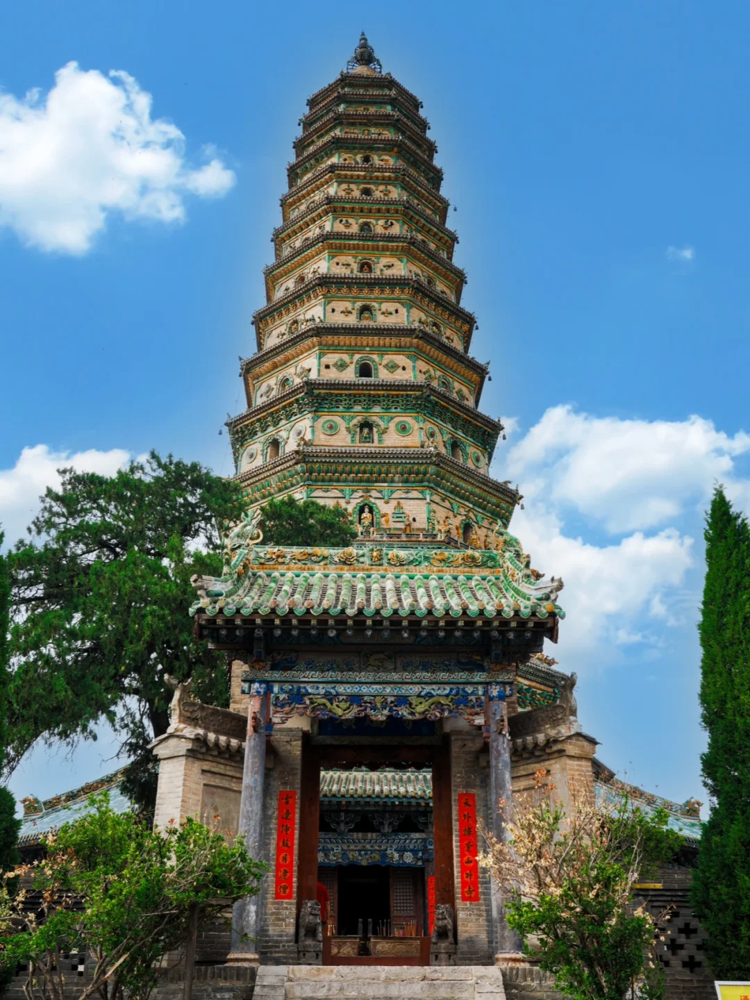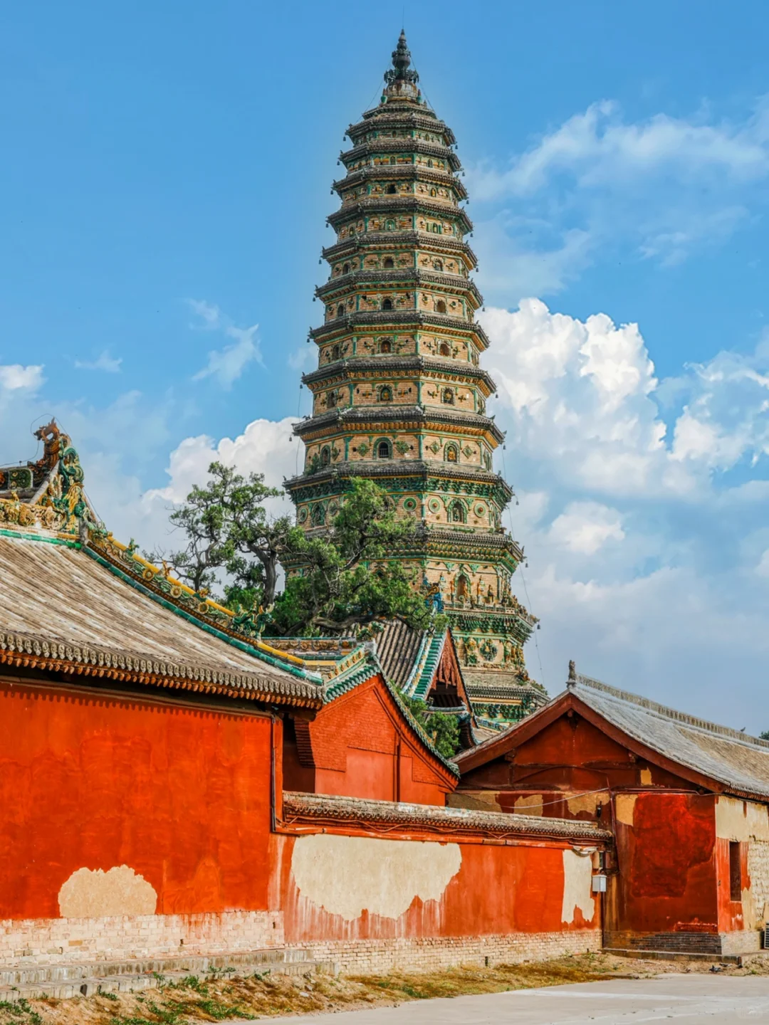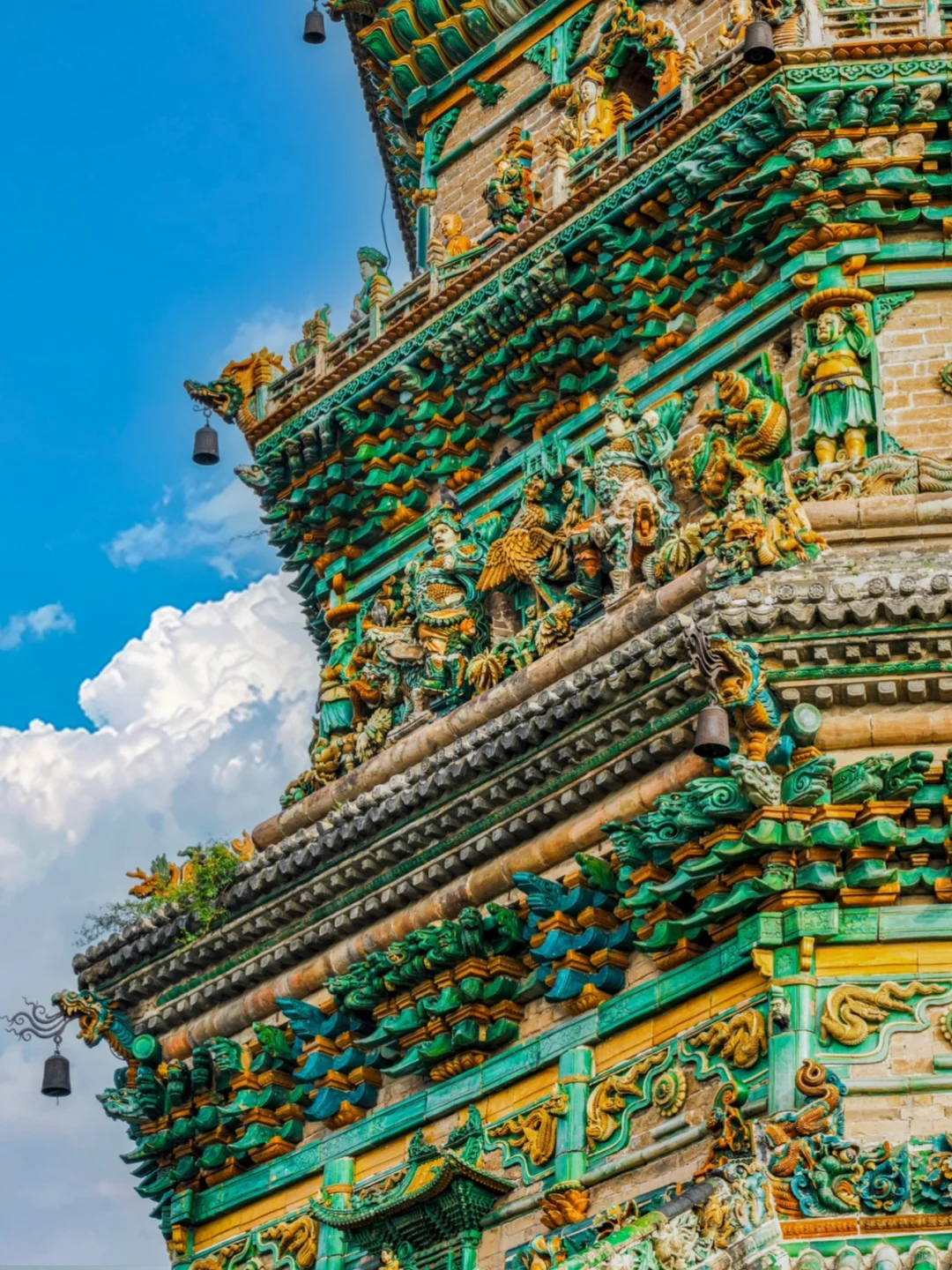 寺内的飞虹塔建成于明嘉靖六年,塔高47.31米,塔身全部使用五色琉璃镶嵌而成,遍布各种琉璃人物与构件,层层叠叠,细节颇多,如同炫技一般