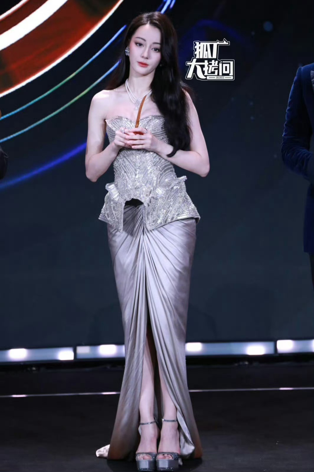 #迪丽热巴银色高定##迪丽热巴银色抹胸开叉裙#