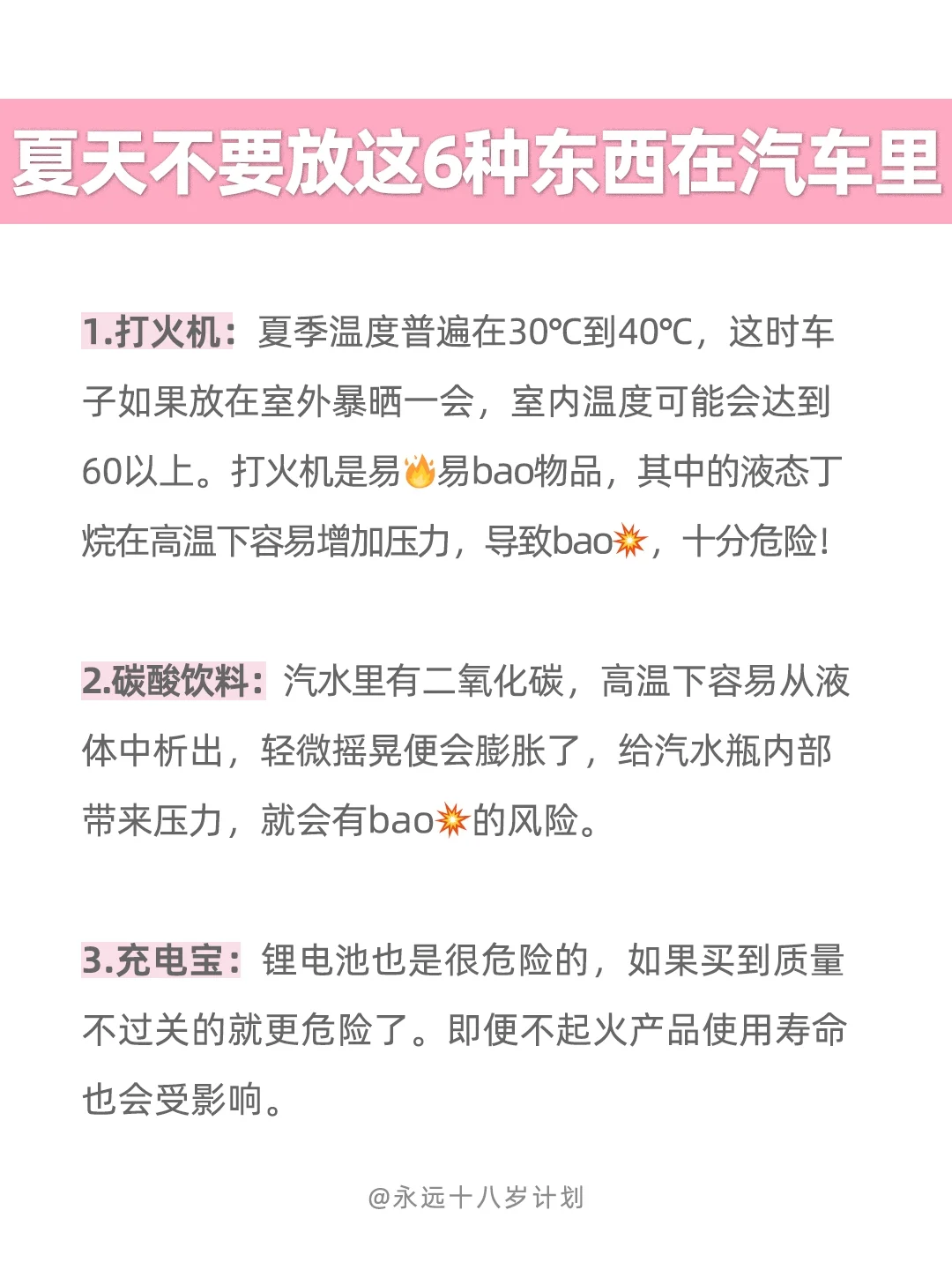 这些东西夏天千万不要放在车内哦!气温高的时候,尽量把车停在地下,或者有树荫的地方更好~
