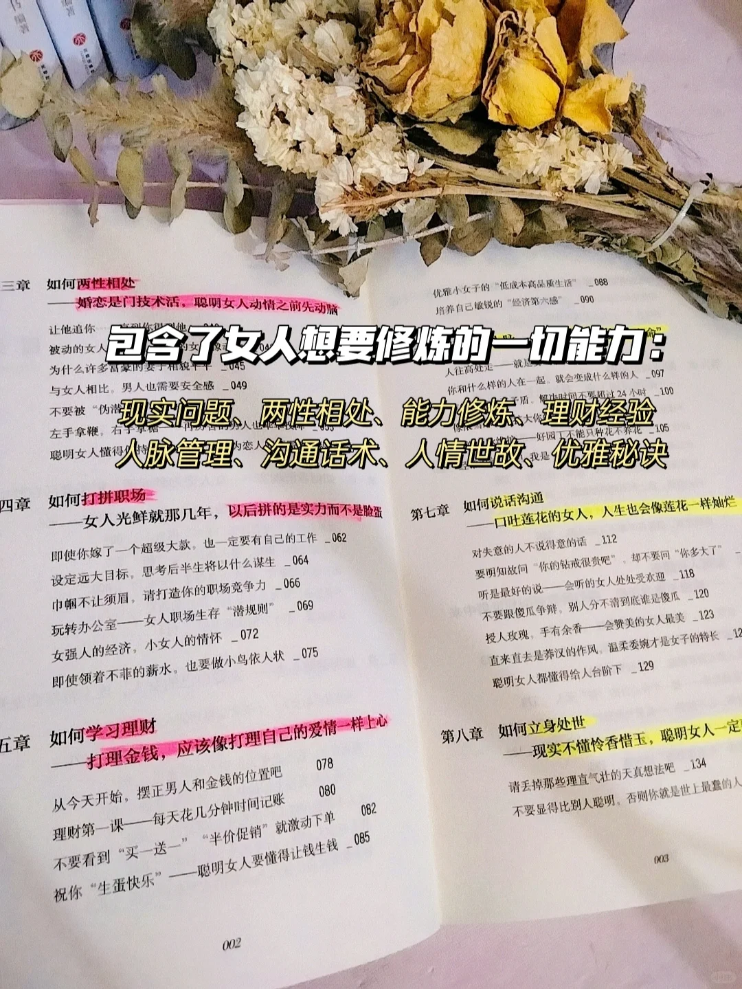 每一个想要脱胎换骨的女生,劝你快去读这本书,真的太太太通透了,它包含了女人想要修.炼的一切能力,比如:现实问题、两性相处、能力修.炼、理财经验、人脉管理、沟通话术、人情世故、优雅秘诀等等,真的宝藏到我想哭😭