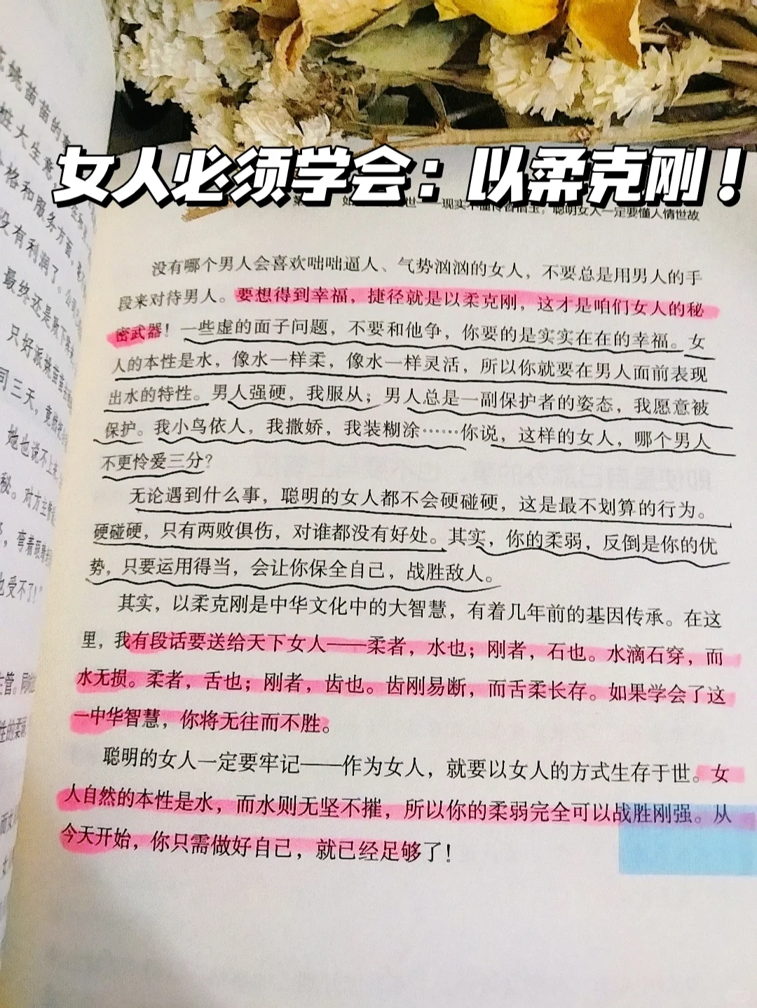 ✅要想得到幸福,捷径就是以柔克刚,女人自然的本性是水,而水则无坚不摧,以柔克刚👉才是女人一生的秘密武.器。(一定要学会,书中有具体案例方法)