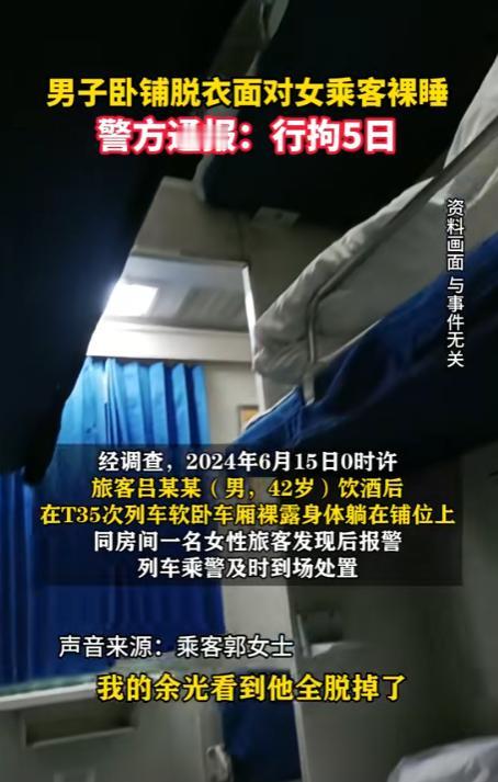 太恶心了,他都不盖被子”!女子坐火车卧铺,原本躺在床上玩手机,余光突然扫到对面床铺的男子,脱光身体在裸睡,本以为这是对方的习惯,没成想,男乘客被子也不盖,对着女子方向做着各种小动作,显然事情没有那么简单。 6月15日的傍晚,夕阳的余晖透过T35次列车的车窗,将车厢内渲染上一层温暖的橙色。 车厢里充满了旅途的疲惫和期待。 郭女士在给自己放了一个长假,完成自己的北京游以后,在火车上给自己定了一个卧铺好好的放纵一下。 劳累了一天,终于躺在卧铺上面进行休息。但是对面男子的奇怪行为让她产生警觉。 夜幕渐渐降临,为了不打扰他人休息,她关掉灯,开始欣赏白天拍摄的照片。 对门的男人显得很不安分,一开始郭女士也没多想,觉得他可能是睡觉姿势不太好。 然而下一刻,她开始怀疑提自己的双眼,一颗心也随之揪了起来,对方竟是当着所有人的面,将自己的衣服全部脱了个精光! 郭小姐只觉得又是恶心又是害怕,她实在想不通,为什么一个男人会在大庭广众之下,把自己的身体袒露得这么露骨?他到底是喝多了,还是故意的? 郭女士脑子里不断地冒出各种各样的想法,恐慌、焦虑的情绪也在她的心中滋生。 她使自己冷静下来。 但是男子并没有对自己的行为产生羞愧,反而是更加大胆的进行挑逗自己。 她感到无比的恶心,同时也担心这个男人会不会做出更加出格的举动。 为了保护自己,女生开始拍下男子的行为。并且在合适的机会找到警察报警。 乘警听闻此事,立刻意识到了问题的严重性,立即跟随郭女士赶往事发车厢。 但是,他们回到车厢的时候,男子已经收拾好自己。 在警察的盘问下,他表现得非常冷静,坚持说自己只是喝多了,根本不记得之前的一切,也不知道自己是光着身子的。 “昨天晚上,我喝了点白酒,然后就醉了,我什么都想不起来了。”男人故作无辜的说道。 但是,这样的说辞并没有让女士信服,因为她清清楚楚的看见当时男子喝的是饮料而已。 当时在女士的证据面前,一切都已经真相大白。 最终,这个男子收到应有的惩罚。 这件事情被曝光后,很多人开始讨论这件事情。 网络上的声音大不相同,大家都有自己的想法。 “裸睡只是一种个人选择,只要不影响他人,就没什么大不了的。”一位网友留言说。 “我觉得应该尊重个人的生活习惯,只要他没有做出更过分的举动,就不应该被拘留。”另一位网友表示。 对此,有法律专家指出,在公共场合赤身裸体,是否构成违法行为,需要根据具体情况具体分析。 无论怎样,我们都不能够把自己的身体隐私部位暴露早i大家的面前,这是我们从小就明白的道理。 信息来源:南昌晚报——6月15日,安徽蚌埠。男子卧铺脱衣面对女乘客裸睡。警方通报:刑拘5日 潇湘晨报——12306回应网友建议实行男女分车厢:将反馈给相关部门进行研究处理