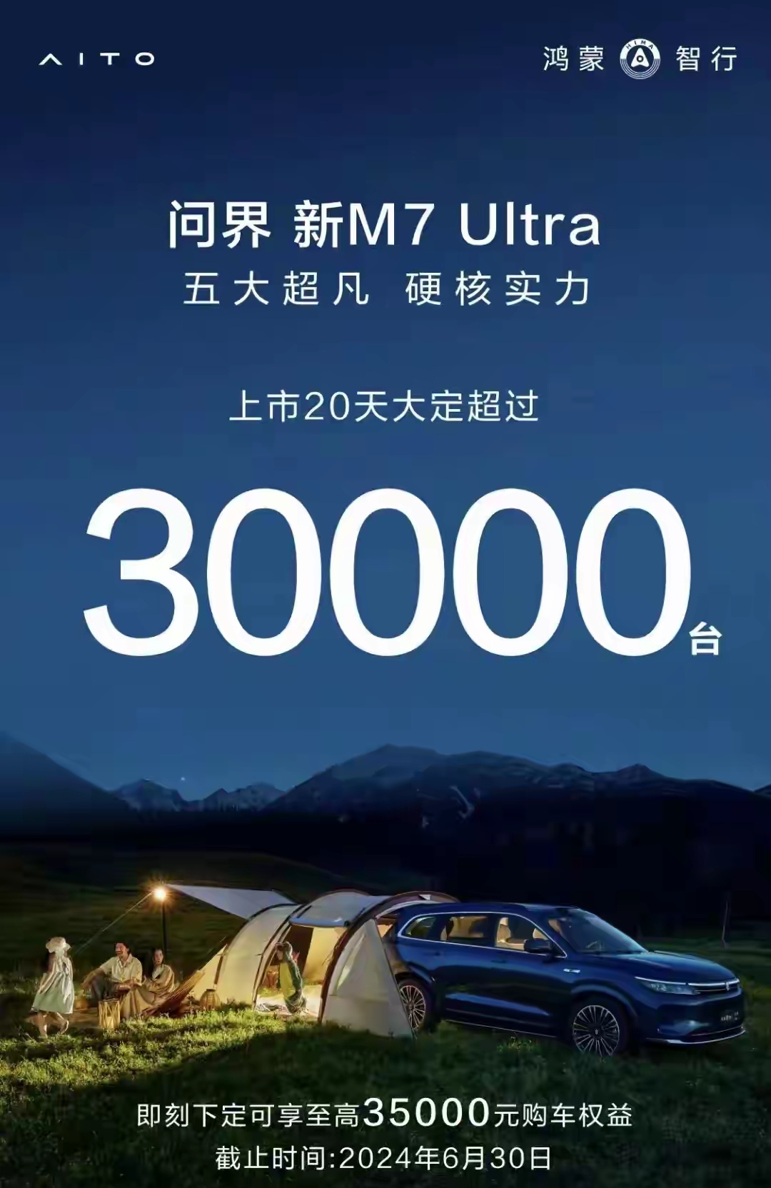 20天卖3万辆,问界新M7 Ultra卖疯了。 问界M7已经持续几个月销量下滑,这也是导致其销量最近一直落后理想的主要原因,本以为问界M7将一蹶不振,没想到这么快就满血复活了,刚才鸿蒙智行官方带来一个好消息,称问界新M7 Ultra上市仅20天,大定就突破了3万台,6月30日前下单,能享受3.5万元购车权益,也就是说相当于免费赠送华为智驾系统,这确实很良心啊。现在鸿蒙智行的销量主力是问界M7和M9,余承东不久前称M9大定突破9万台,现在应该突破了10万,虽然M9月销量超过56E,但面对这个订单量,产能已经不足,赛力斯要加班加点了。