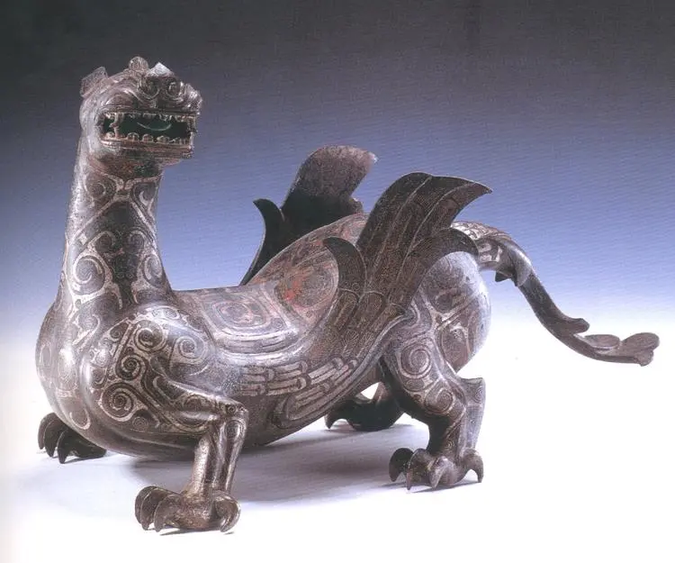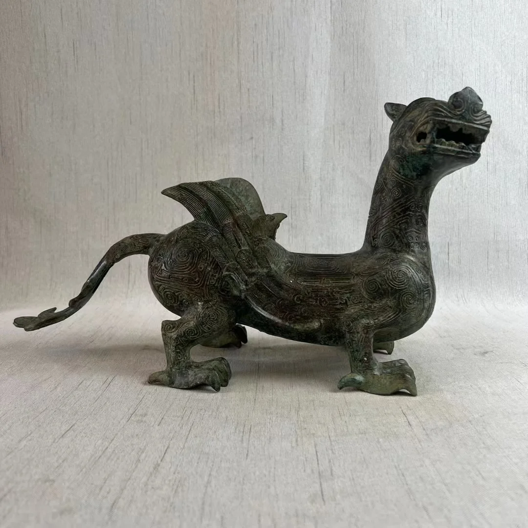 双翼神兽长40厘米。神兽曲颈昂首怒吼,两肋生翼,臀部隆起,四肢弓曲,跃跃欲起。通身错银,身躯为卷云纹,兽翼有长羽纹。背部装饰两只左右对称的错银鸟纹。底部铸有铭文,说明制作时间、工匠及监造官吏。河北省博物馆门前的镇兽就是采用放大版的双翼神兽形象。