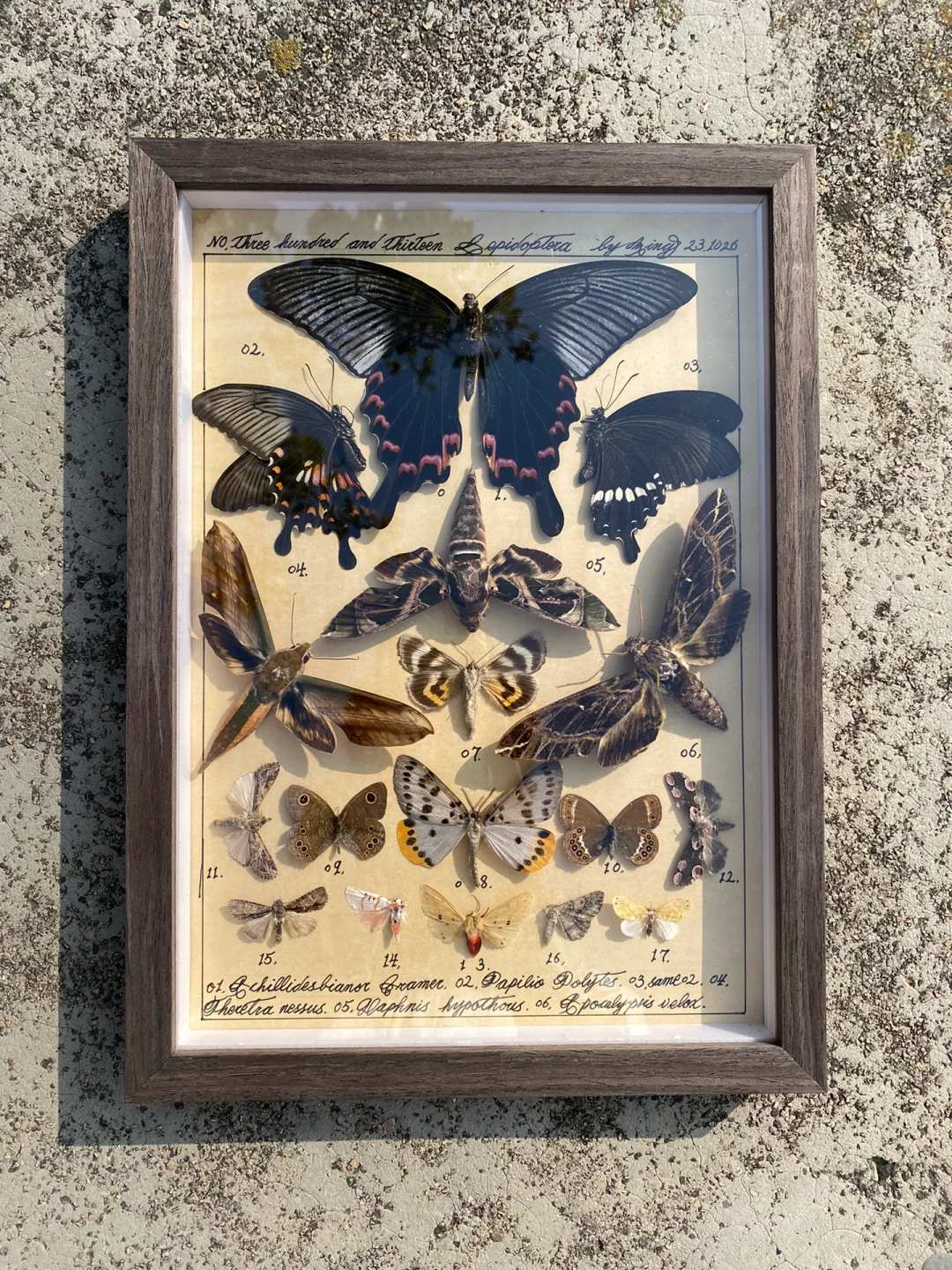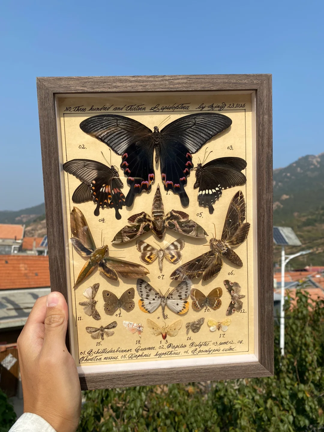 小伙伴问我可以换成颜色更深的框子吗?我说可以呀,就换掉了。这幅蝴蝶标本图鉴作品是去年10月做的,我还加了一些蛾子进去,最近嫁出去啦~
