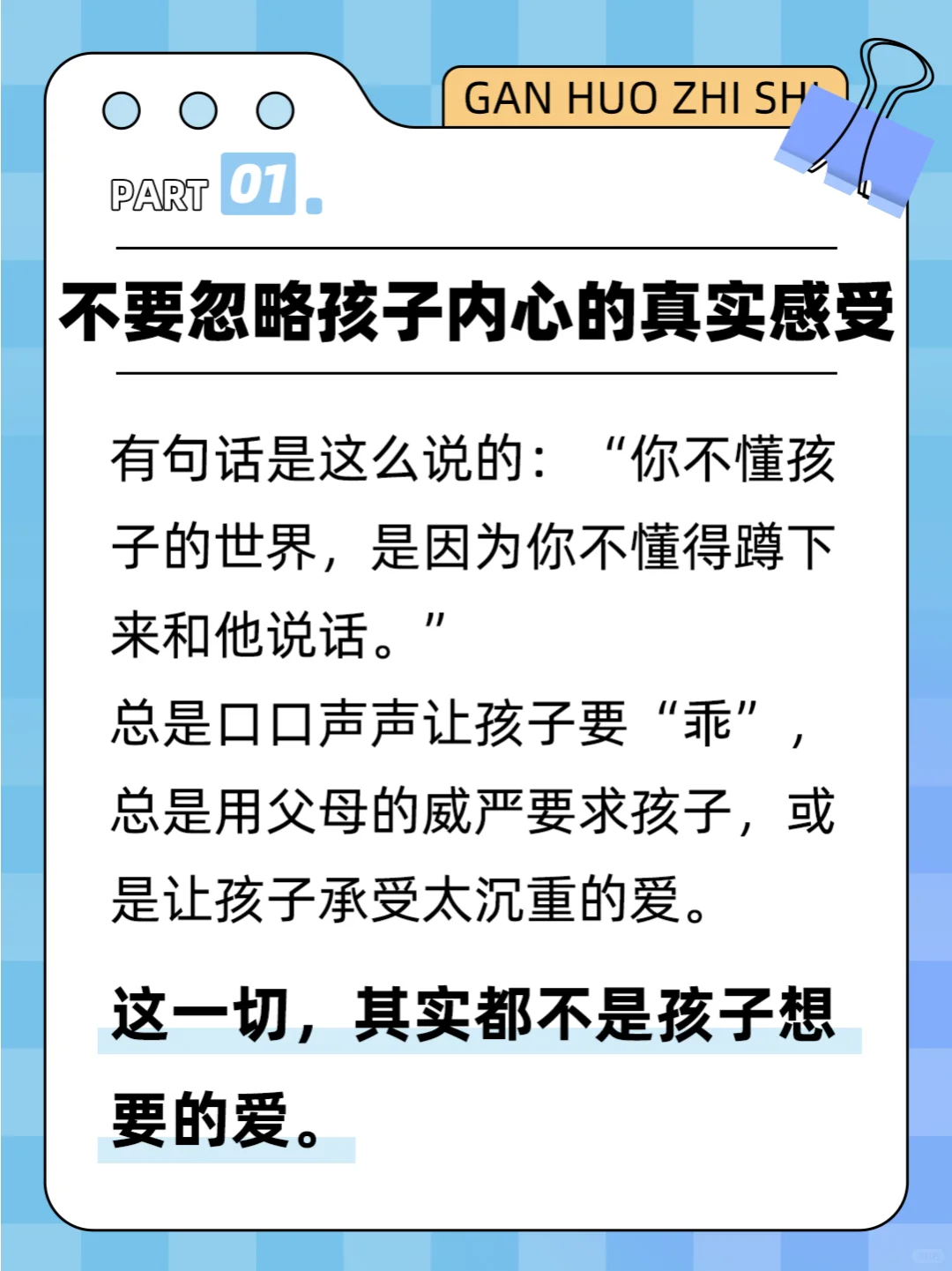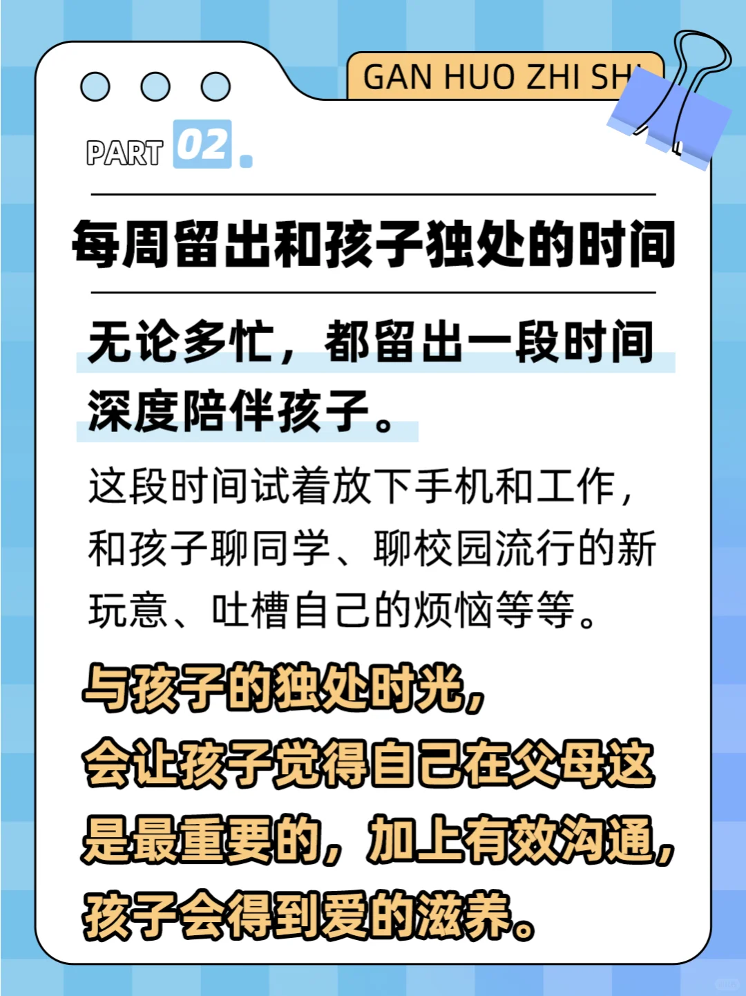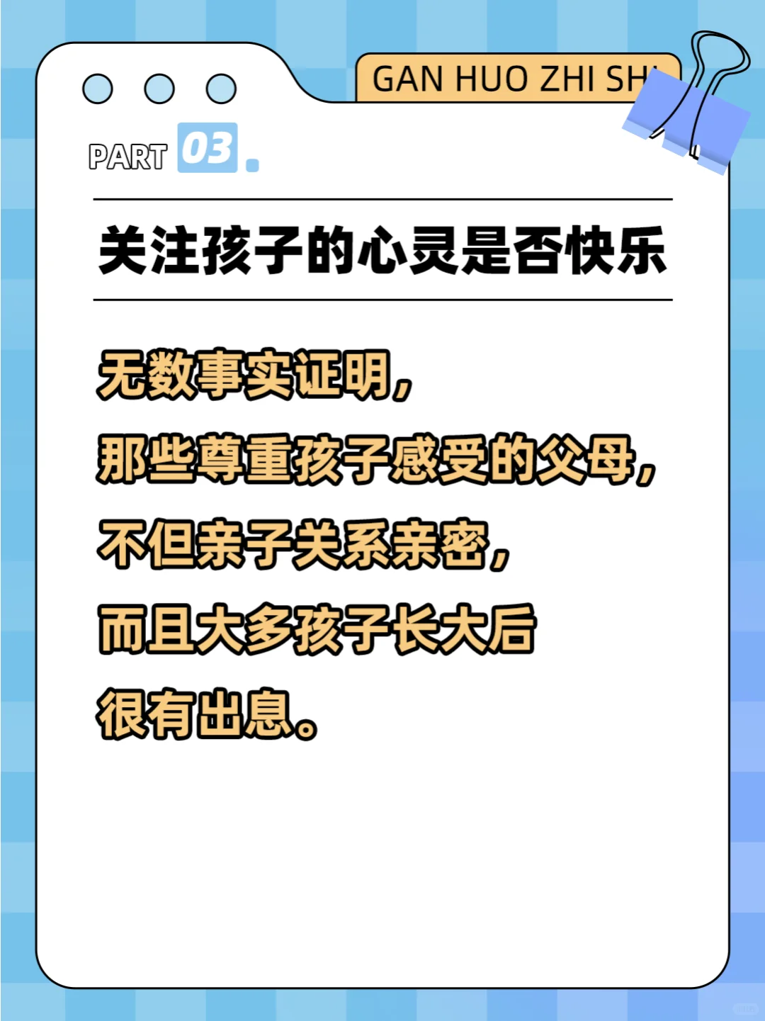 1️⃣不要忽略孩子内心的真实感受💓 2️⃣每周留出和孩子独处的时间⏰ 3️⃣尊重孩子,关注孩子的心灵是否快乐😊