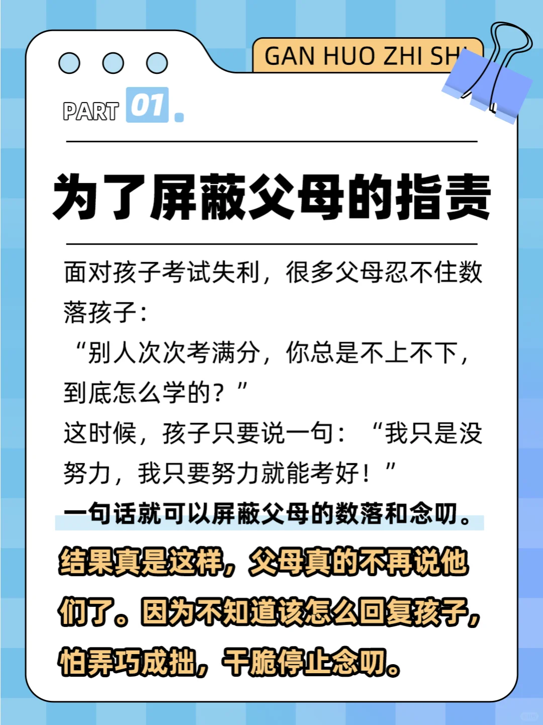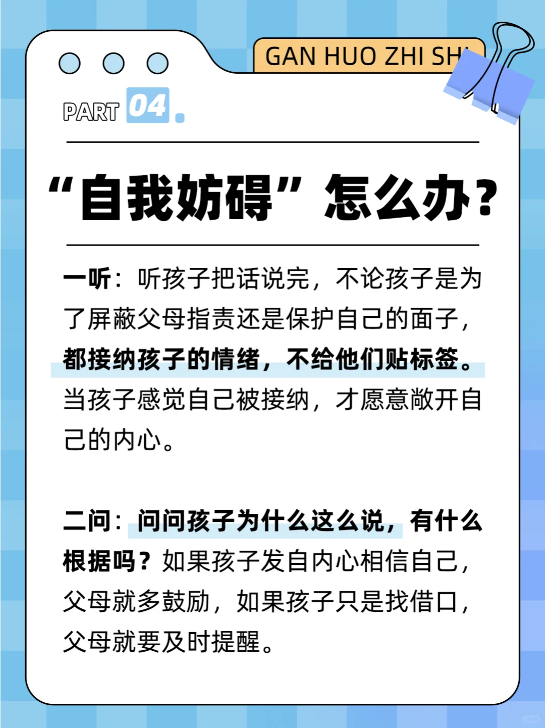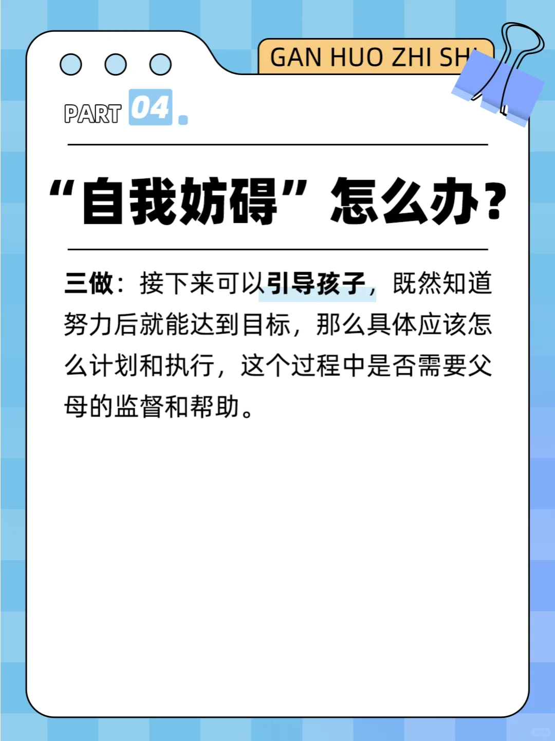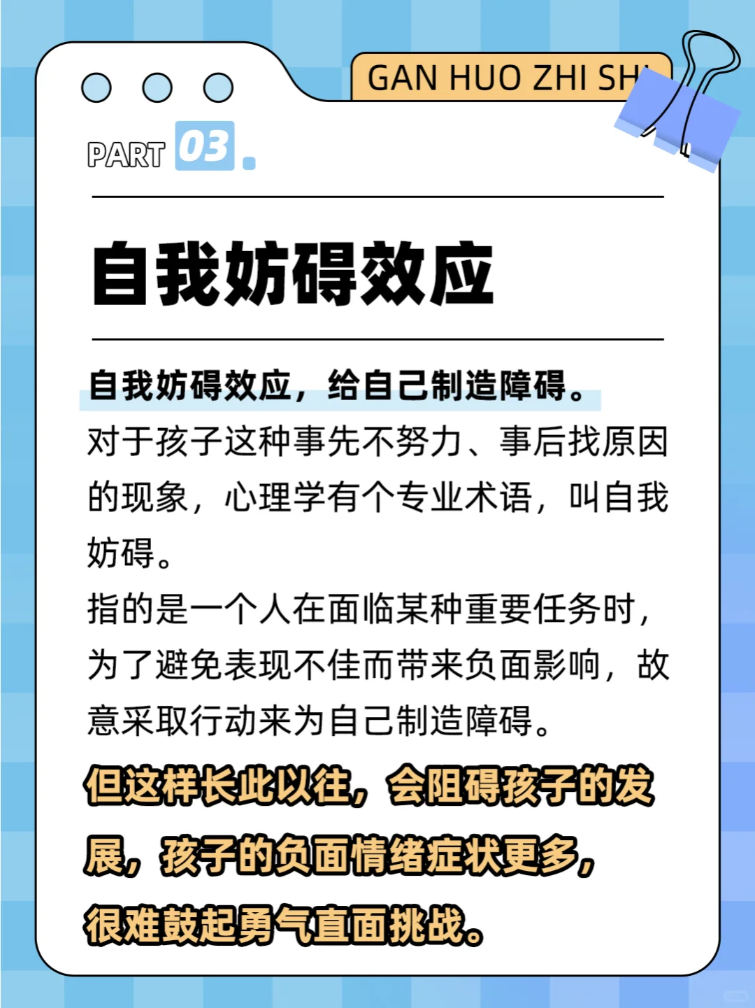 1️⃣为了屏蔽父母的指责🛡️ 2️⃣觉得学习并不难🧠 3️⃣自我妨碍效应,给自己制造障碍⚠️ 4️⃣孩子陷入“自我妨碍”怎么办?🤔