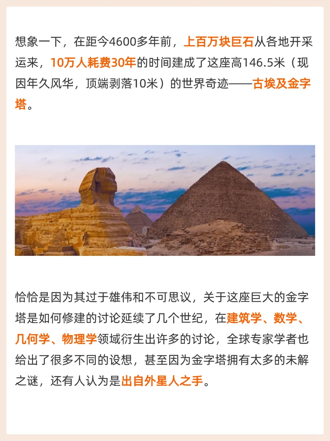 距今4600多年前,上百万块巨石从各地开采运来,10万人耗费30年的时间建成了这座高146.5米(现因年久风华,顶端剥落10米)的世界奇迹——古埃及金字塔。